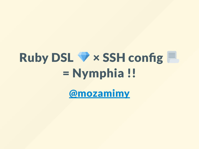 VPS' do hostname 'alice.example.com' user 'alice' port 4321 use_identify_file :private end load 'other_nymphia_file.nym.rb' load で別ファイルを読み込める 単一の con g として出力される 11