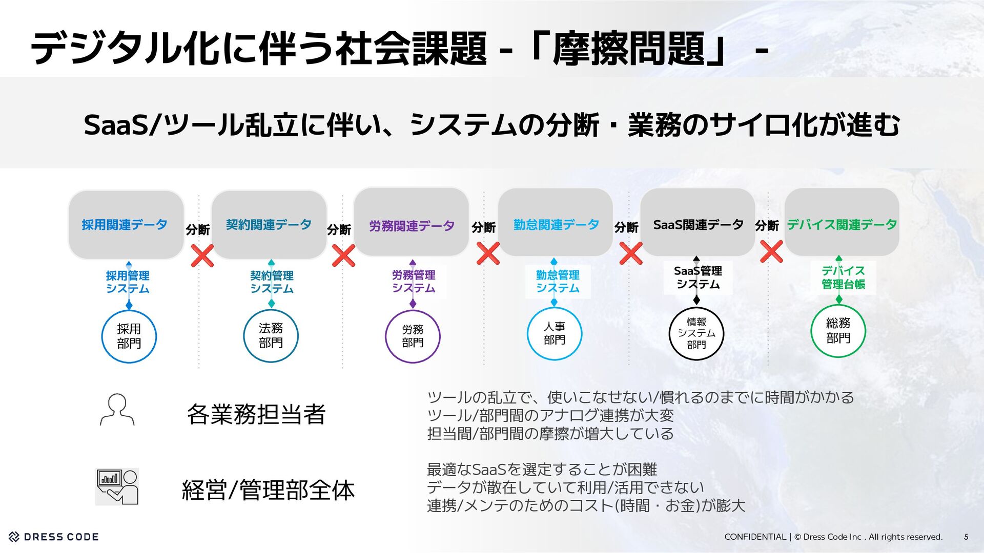 デジタル化に伴う社会課題 -「摩擦問題」 - SaaS/ツール乱立に伴い、システムの分断・業務のサイロ化が進む 採用 部門 法務 部門 労務 部門 人事 部門 情報 システム 部門 総務 部門 採用管理 システム 契約管理 システム 労務管理 システム 勤怠管理 システム SaaS管理 システム デバイス 管理台帳 採用関連データ 契約関連データ 労務関連データ 勤怠関連データ SaaS関連データ デバイス関連データ ツールの乱立で、使いこなせない/慣れるのまでに時間がかかる ツール/部門間のアナログ連携が大変 担当間/部門間の摩擦が増大している 各業務担当者 経営/管理部全体 最適なSaaSを選定することが困難 データが散在していて利用/活用できない 連携/メンテのためのコスト(時間・お金)が膨大 ❌