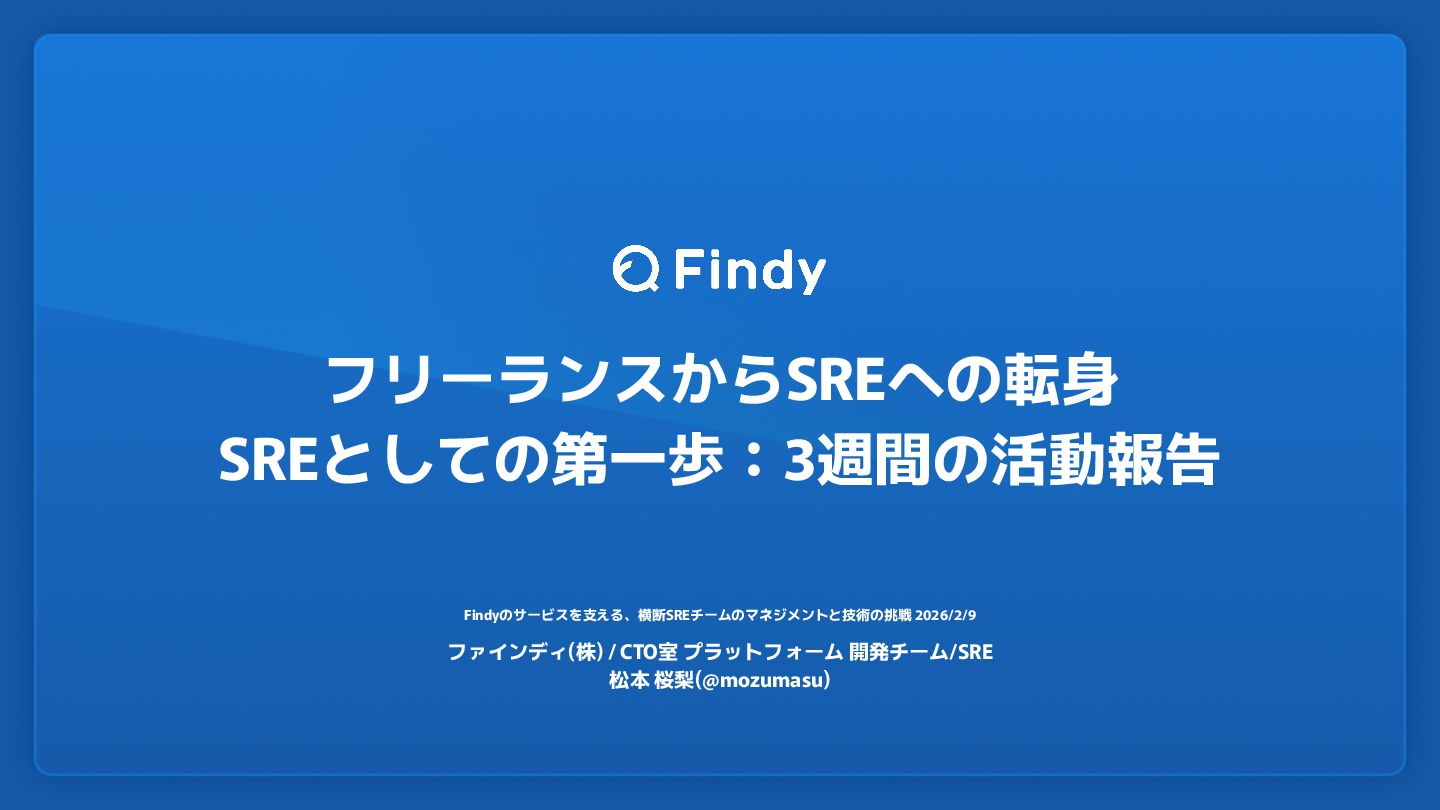 フリーランスからSREへの転身 SREとしての第一歩:3週間の活動報告 Findyのサービスを支える、横断SREチームのマネジメントと技術の挑戦 2026/2/9 ファインディ(株) / CTO室 プラットフォーム 開発チーム/SRE 松本