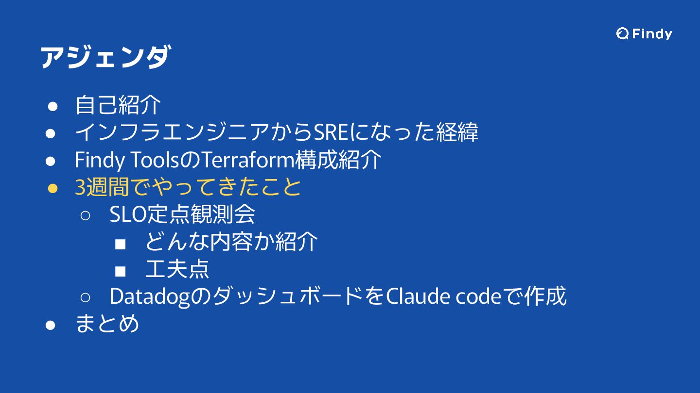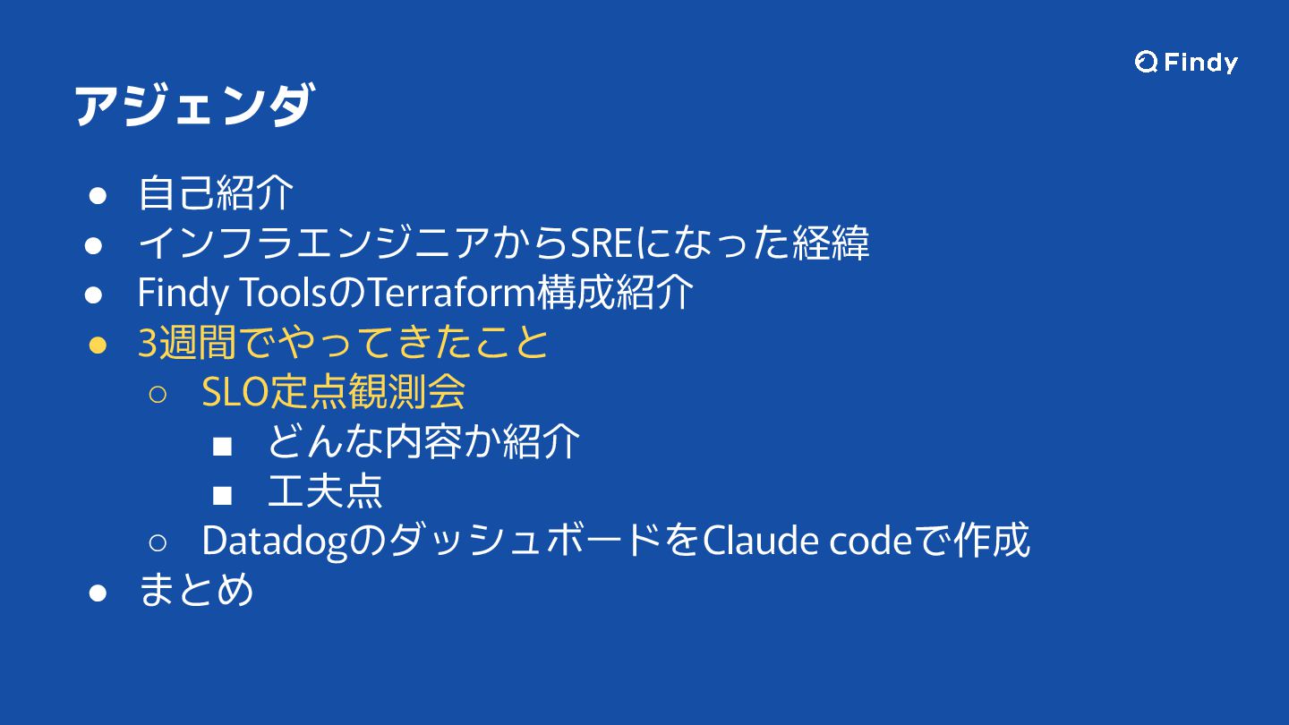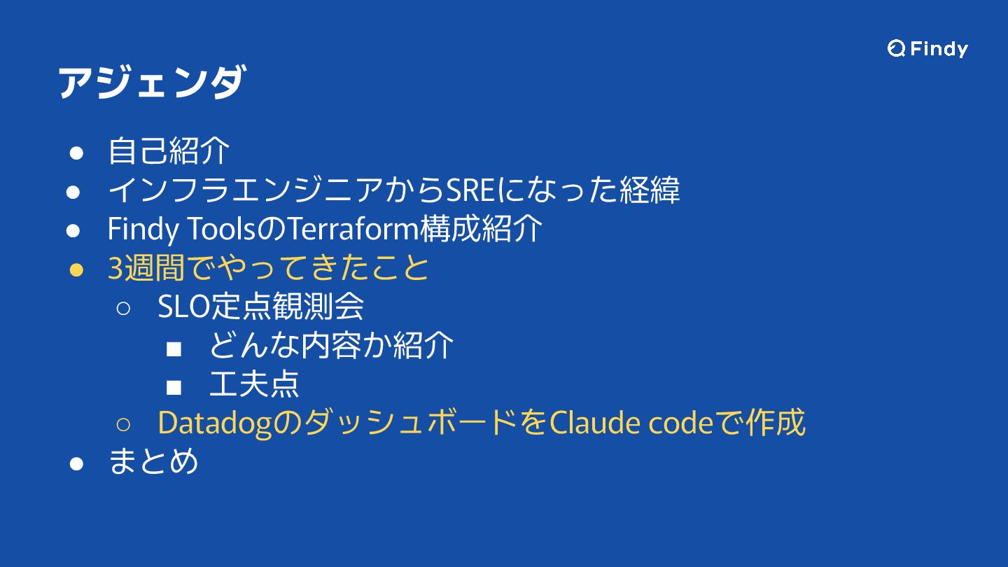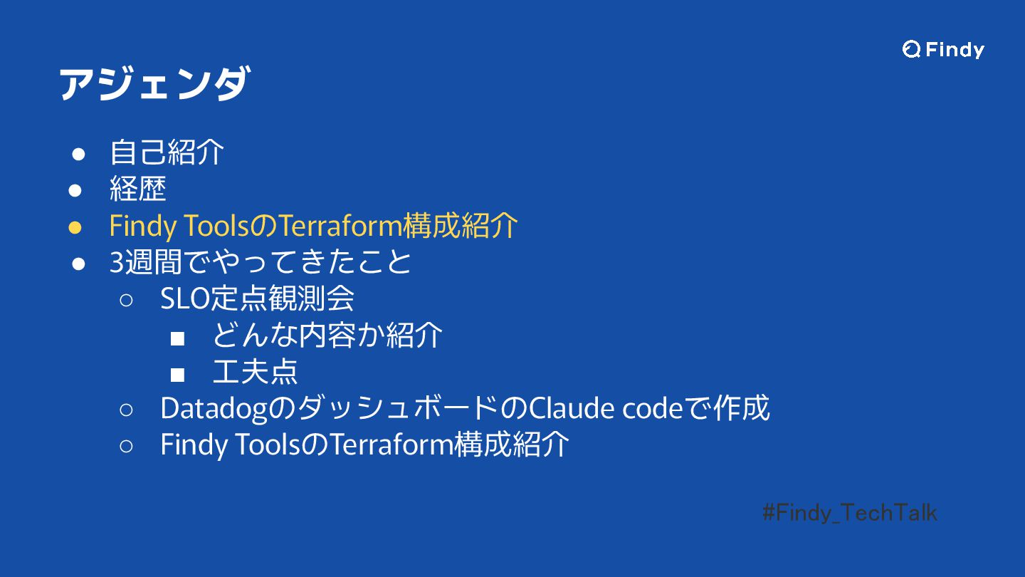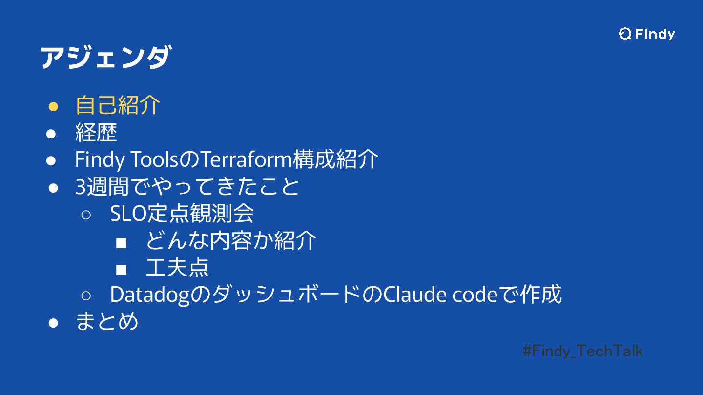 ◦ SLO定点観測会 ▪ どんな内容か紹介 ▪ 工夫点 ◦ DatadogのダッシュボードのClaude codeで作成 ◦ Findy ToolsのTerraform構成紹介 #Findy_TechTalk