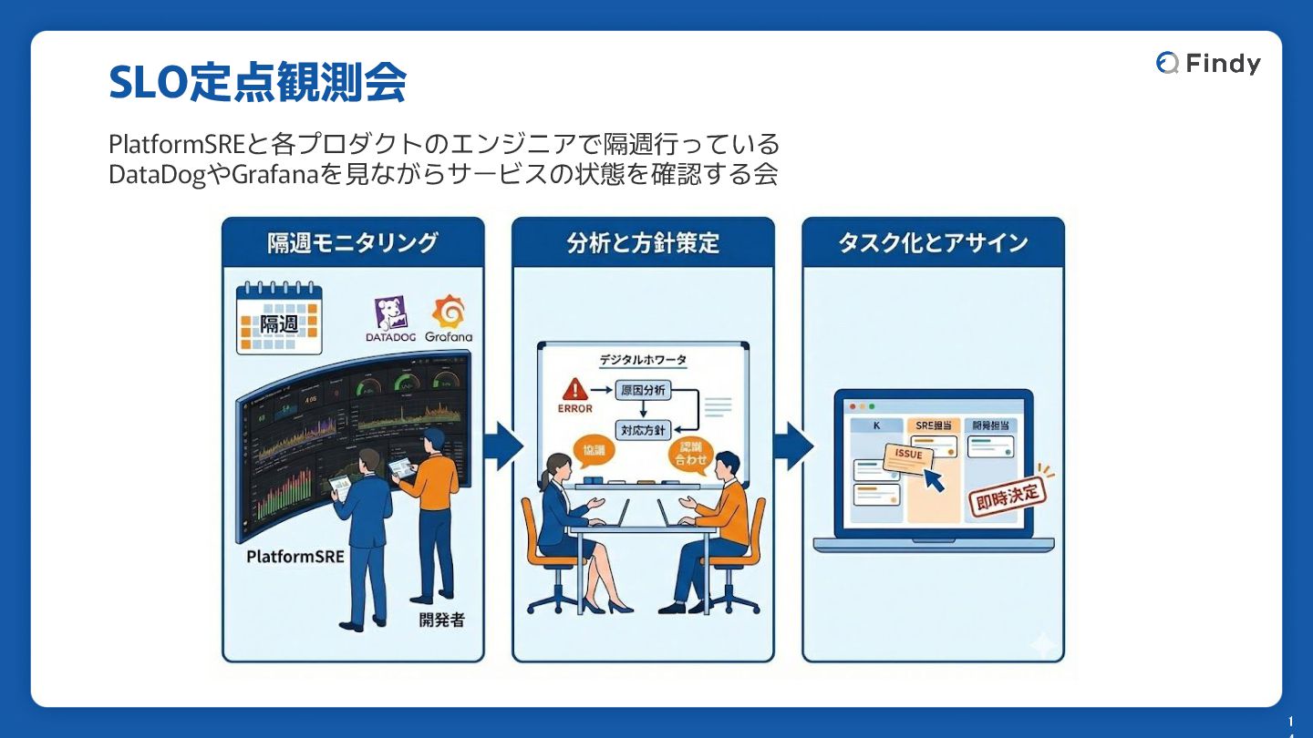 1 SLO定点観測会 PlatformSREと各プロダクトのエンジニアで隔週行っている DataDogやGrafanaを見ながらサービスの状態を確認する会