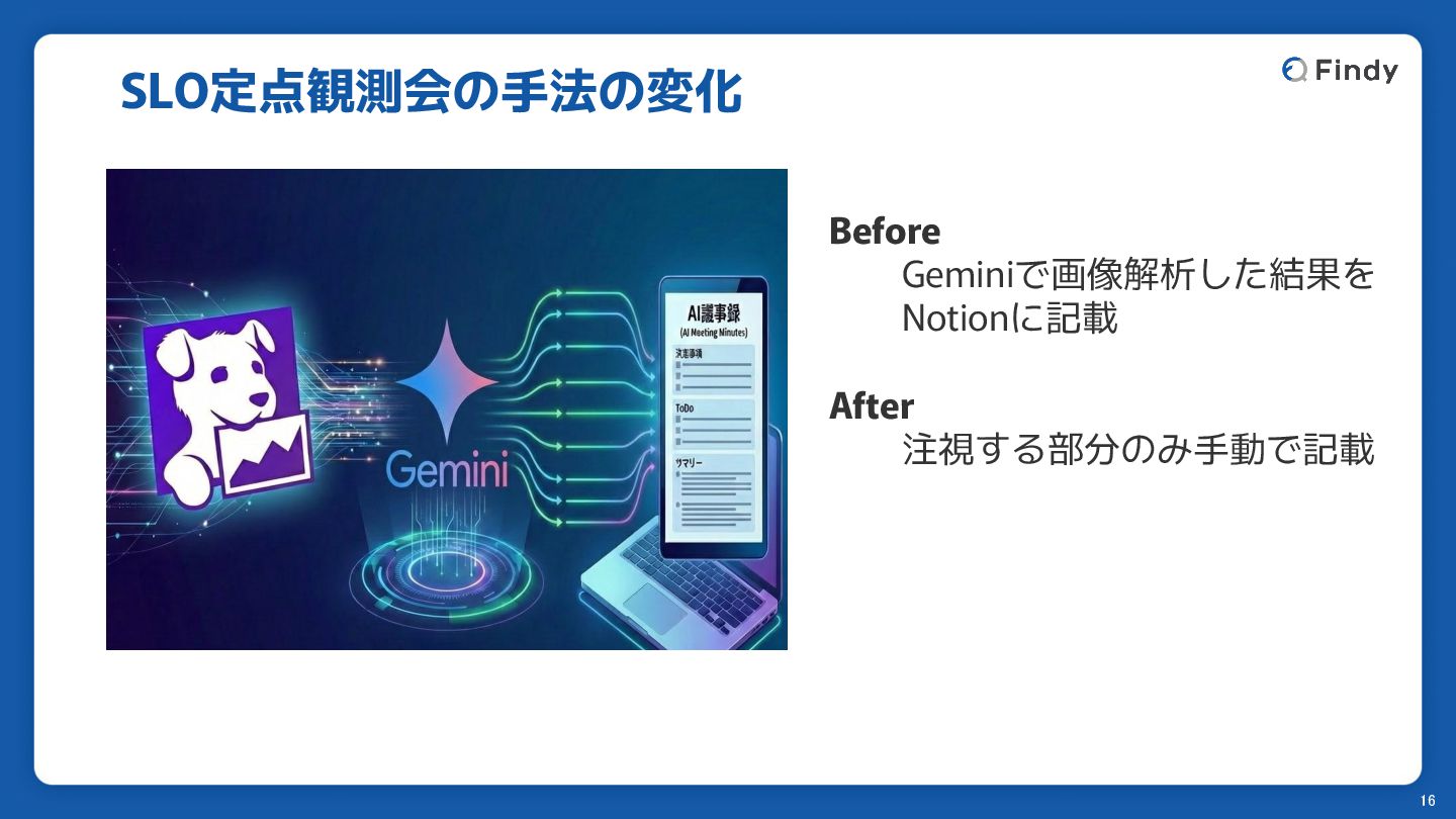 16 SLO定点観測会の手法の変化 Before Geminiで画像解析した結果を Notionに記載 After 注視する部分のみ手動で記載