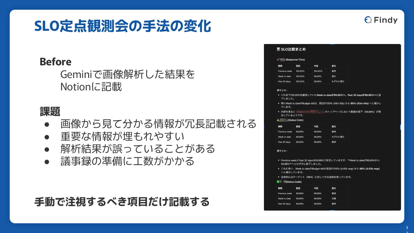 1 SLO定点観測会の手法の変化 Before Geminiで画像解析した結果を Notionに記載 課題 • 画像から見て分かる情報が冗長記載される • 重要な情報が埋もれやすい