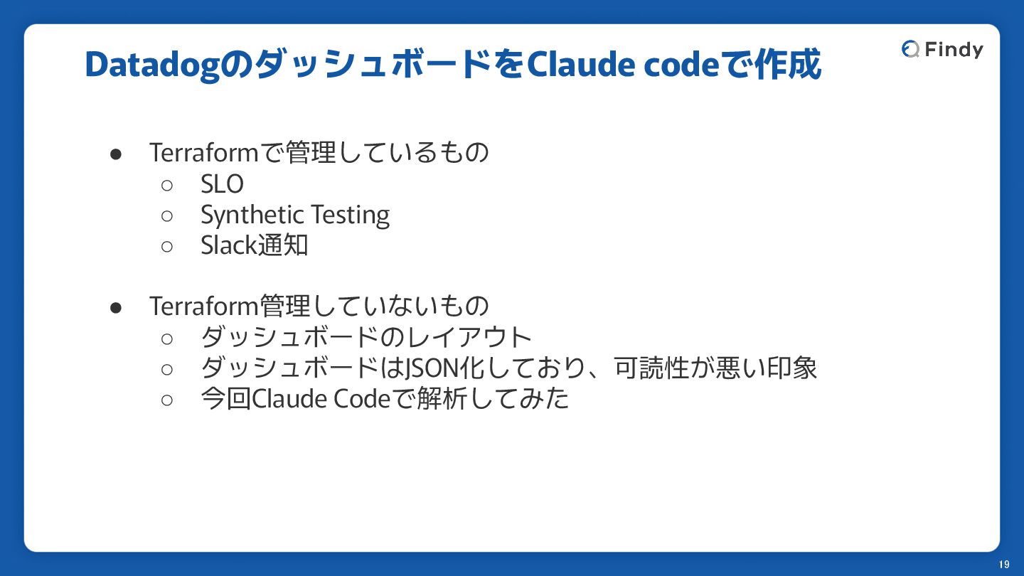 19 DatadogのダッシュボードをClaude codeで作成 • Terraformで管理しているもの ◦ SLO ◦ Synthetic Testing
