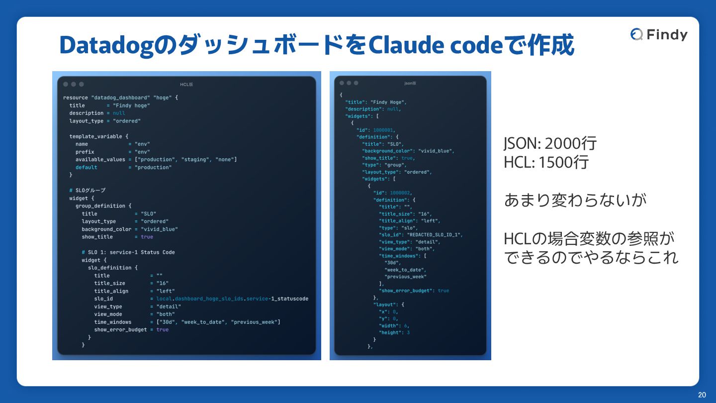 20 DatadogのダッシュボードをClaude codeで作成 JSON: 2000行 HCL: 1500行 あまり変わらないが HCLの場合変数の参照が できるのでやるならこれ