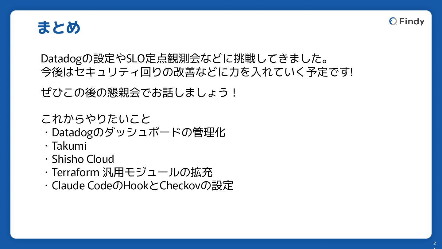 2 まとめ Datadogの設定やSLO定点観測会などに挑戦してきました。 今後はセキュリティ回りの改善などに力を入れていく予定です! ぜひこの後の懇親会でお話しましょう! これからやりたいこと ・Datadogのダッシュボードの管理化 ・Takumi ・Shisho Cloud