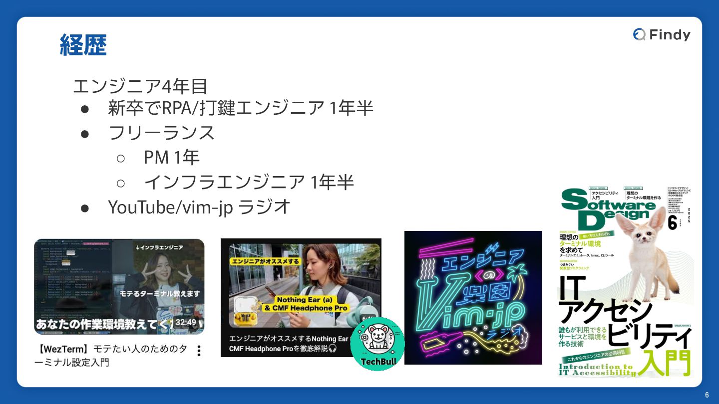 PM 1年 ◦ インフラエンジニア 1年半 • YouTube/vim-jp ラジオ