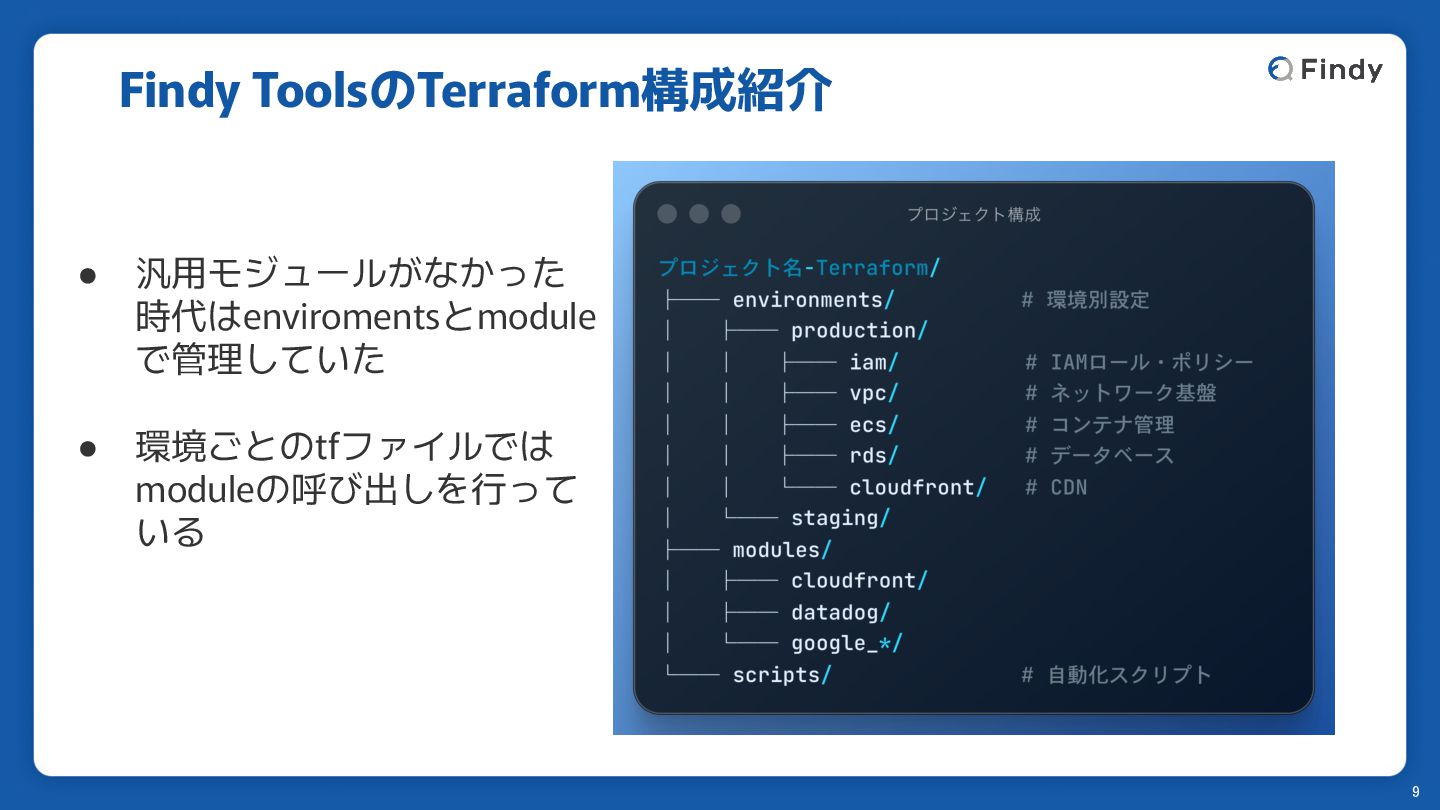 9 Findy ToolsのTerraform構成紹介 • 汎用モジュールがなかった 時代はenviromentsとmodule で管理していた • 環境ごとのtfファイルでは moduleの呼び出しを行って
