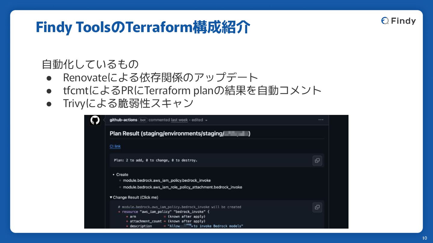 10 Findy ToolsのTerraform構成紹介 自動化しているもの • Renovateによる依存関係のアップデート • tfcmtによるPRにTerraform planの結果を自動コメント •