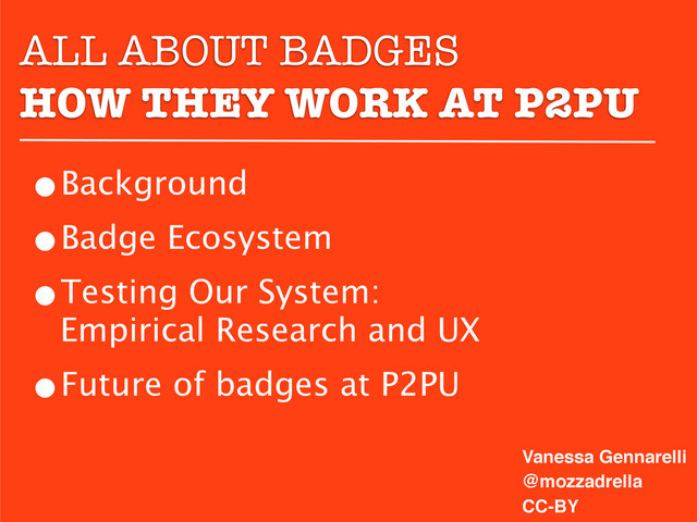 • Research Questions • Relationship between badges and participation • Measure community activity around “accredited” versus “user-generated” badges • How “open” to everyone is open ed? Vanessa Gennarelli @mozzadrella CC-BY TESTING OUR SYSTEM: EMPIRICAL RESEARCH