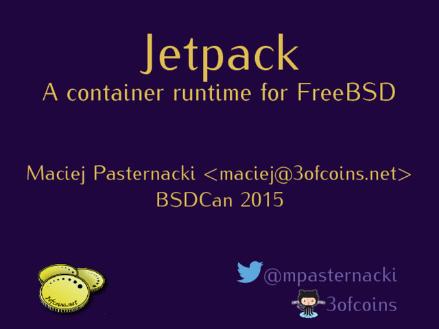 & lockdown ❧ ZFS for layered storage ❧ Runs Linux images (as allowed by FreeBSD's emulation) ❧ Breaks Linux monoculture (hopefully) ❧ Half year old this Monday https://github.com/3ofcoins/jetpack/