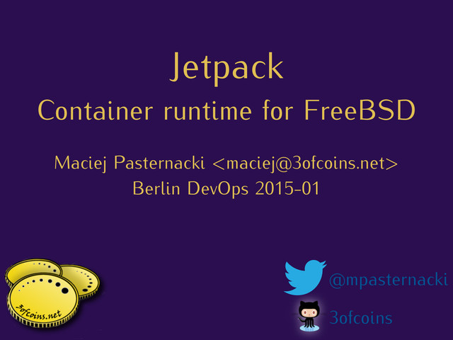 separation (VIMAGE) – Resource limiting (RCTL) – Firewall/NAT rules management (pf) – Image discovery & distribution – A LOT MORE… it’s still a prototype! https://github.com/3ofcoins/jetpack/