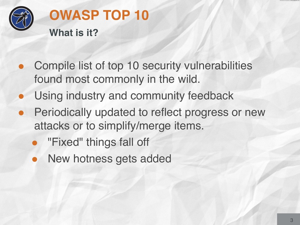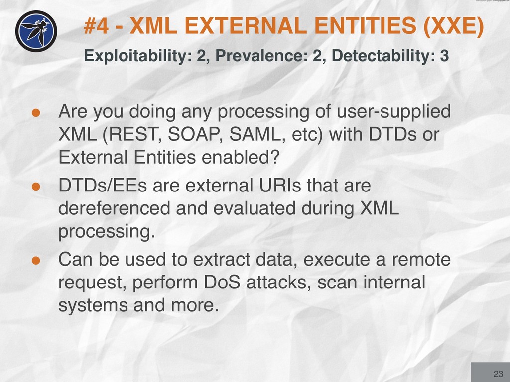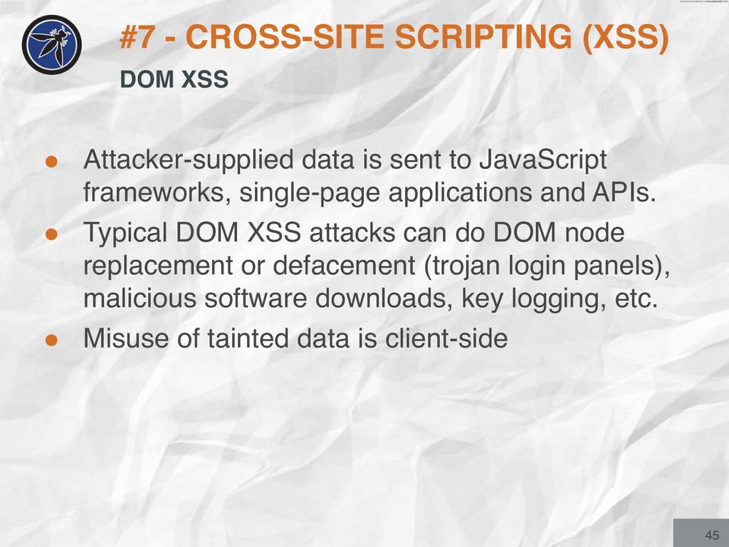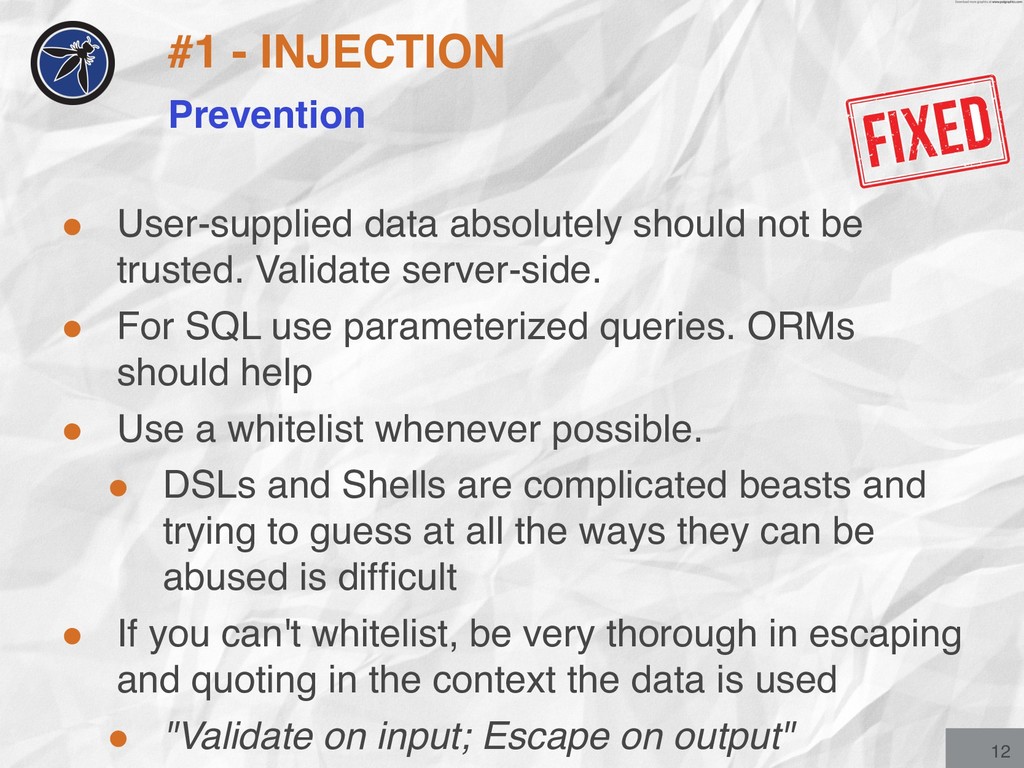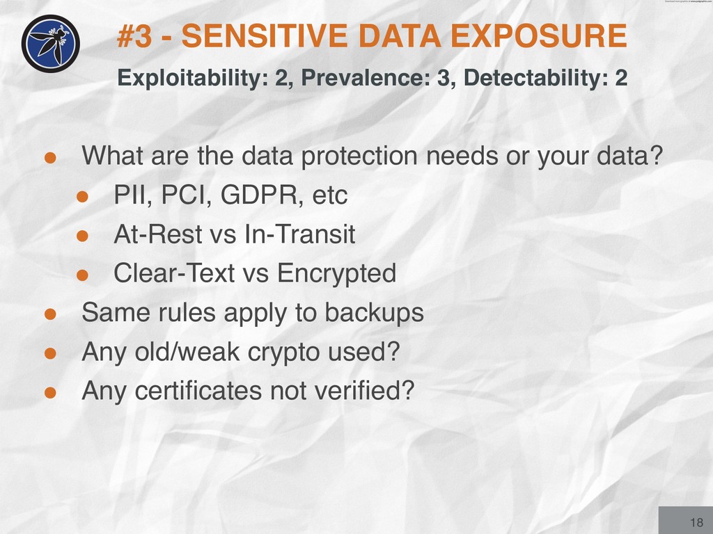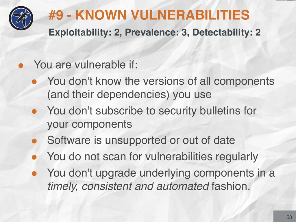 OWASP recently updated their Top 10 list of Web Application Vulnerabilities. In this talk we’ll break down each vulnerability category, giving an overview, examples of the vulnerability in action, and how you can protect your application from exploitation. All examples will be language and framework agnostic so you can apply it to a wide range of projects. We’ll talk about what has changed on the list since last time it was updated and what new threats are surfacing. We’ll also spend some time talking about various processes and tools you can use to make sure your next project doesn’t end up as a morality tale for other technologists. Whether you’re an application developer, or looking to add security automation to your DevOps pipeline, this talk will help fill in the gaps.