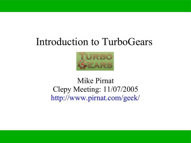 thanks to Easy Install: sudo python ez_setup.py f http://www.turbogears.org/download/index.html \ scriptdir /usr/local/bin TurboGears • TG and friends are distributed as Python Eggs • Upgrading has been tricky, often requiring updates to the update framework in order to get the latest versions installed correctly • Eggs and other package systems not well reconciled yet; potential for conflicts and problems; Internet connection required! • Switching from release to SVN is tricky