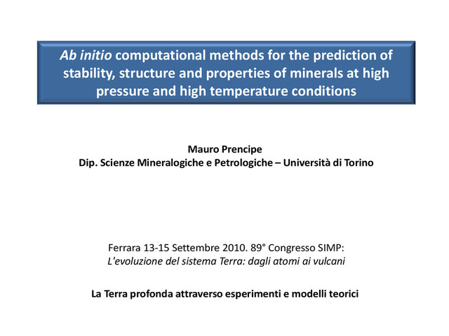 and properties of minerals at high pressure and high temperature conditions Mauro Prencipe Dip. Scienze Mineralogiche e Petrologiche – Università di Torino Ferrara 13-15 Settembre 2010. 89° Congresso SIMP: L'evoluzione del sistema Terra: dagli atomi ai vulcani La Terra profonda attraverso esperimenti e modelli teorici