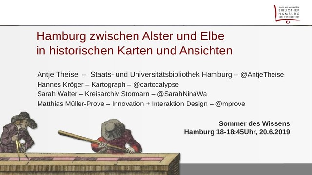 Referent*innen: Antje Theise (Staats- und Universitätsbibliothek Hamburg Carl von Ossietzky), Hannes Kröger (Kartograph), Sarah Walter (Kreisarchiv Stormarn), Matthias Müller-Prove (Interaktionsdesigner, mprove.de)