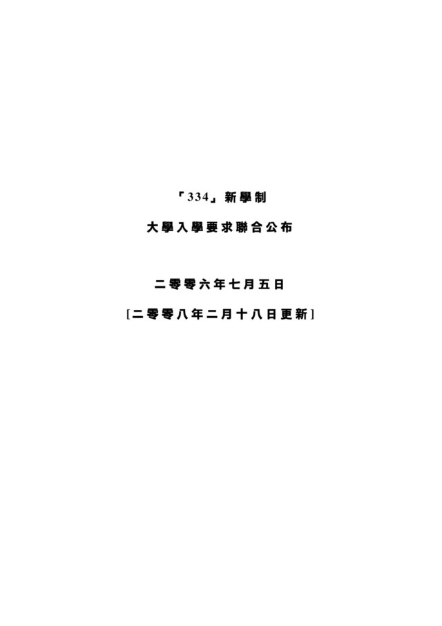 高 等 教 育 新 學 制 將 於 二 零 零 九 年 九 月 推 行 。 公 布 大 學 入 學 要 求 是 推 行 新 高 中 學 制 的 一 個 重 要 里 程 碑 。 二 零 零 五 年 , 各 大 院 校 宣 布 支 持 將 中 學 課 程 的 全 部 四 個 核 心 科 目 ( 中 國 語 文 、 英 國 語 文 、 數 學 及 通 識 教 育 ) 列 為 大 學 基 本 必 要 入 學 要 求 。 為 方 便 學 校 規 劃 新 高 中 課 程 , 各 大 院 校 現 已 訂 定 其 學 系 / 學 院 / 課 程 的 入 學 要 求 , 並 訂 明 所 需 的 新 高 中 科 目 。 個 別 院 校 的 要 求 載 列 於 附 表 。 申 請 入 讀 學 士 學 位 課 程 者 , 必 須 符 合 一 般 入 學 要 求 , 以 及 有 關 學 系 / 學 院 / 課 程 的 入 學 要 求 ; 或 具 備 有 關 院 校 認 為 等 同 所 述 要 求 的 其 他 學 歷 。 這 些 入 學 要 求 屬 最 低 要 求 , 並 不 保 證 申 請 人 可 入 讀 某 一 院 校 或 修 讀 某 一 課 程 。 各 大 院 校 會 繼 續 現 行 做 法 , 即 接 受 其 他 語 文 替 代 「 3 3 4 」 新 學 制 的 中 國 語 文 , 但 會 視 乎 需 要 作 出 修 訂 。 [ 部 分 院 校 在 申 請 人 沒 有 修 讀 中 國 語 文 的 情 況 下 , 才 會 考 慮 接 受 以 其 他 語 文 替 代 。 ] 各 大 院 校 認 同 , 訂 明 個 別 學 系 / 學 院 的 入 學 要 求 , 要 盡 量 在 高 中 課 程 的 學 生 選 科 及 學 校 規 劃 方 面 , 產 生 正 面 的 影 響 。 其 中 一 個 特 點 是 : 為 配 合 提 供 基 礎 更 廣 闊 的 課 程 這 個 目 標 , 各 大 院 校 支 持 把 組 合 科 學 ( 物 理 、 化 學 或 生 物 其 中 兩 科 的 組 合 ) 及 單 一 科 學 學 科 一 併 列 為 入 學 要 求 , 讓 學 生 有 更 多 空 間 , 從 各 學 習 領 域 選 擇 符 合 本 身 興 趣 的 選 修 科 目 , 以 擴 闊 他 們 的 學 習 及 知 識 基 礎 , 為 修 讀 大 學 課 程 做 好 準 備 。 各 大 院 校 亦 會 考 慮 在 甄 選 學 生 時 , 參 考 更 廣 泛 的 資 料 , 即 學 生 在 不 同 範 疇 所 取 得 的 成 績 , 並 讓 學 生 有 機 會 證 明 他 們 具 有 入 讀 學 士 學 位 課 程 所 需 的 能 力 及 個 人 質 素 。 各 大 院 校 現 正 制 訂 四 年 制 學 士 學 位 課 程 的 方 針 。 這 是 一 個 動 態 過 程 , 各 大 院 校 會 繼 續 致 力 配 合 高 中 課 程 。 隨 着 四 年 制 大 學 課 程 規 劃 工 作 的 進 行 , 各 院 校 會 對 有 關 要 求 作 出 所 需 的 調 整 。
