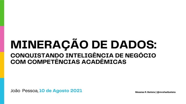 Engenheiro e Cientista de Dados Minsait at Indra Company Aluno de Mestrado PPG em Engenharia da Computação, UPE Organizador, GDG João Pessoa Google Developer Group João Pessoa Empreendedor Geek Time Messias R. Batisa Engenheiro e Cientista de Dados Minsait at Indra Company