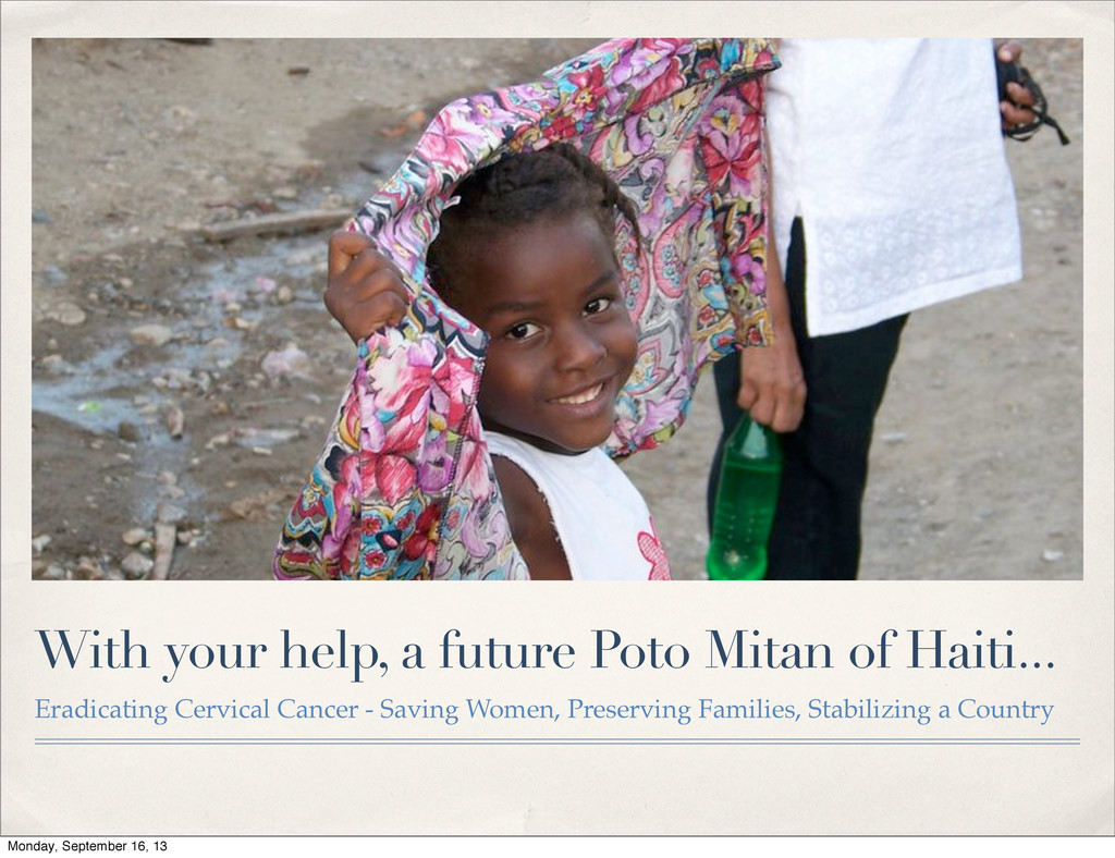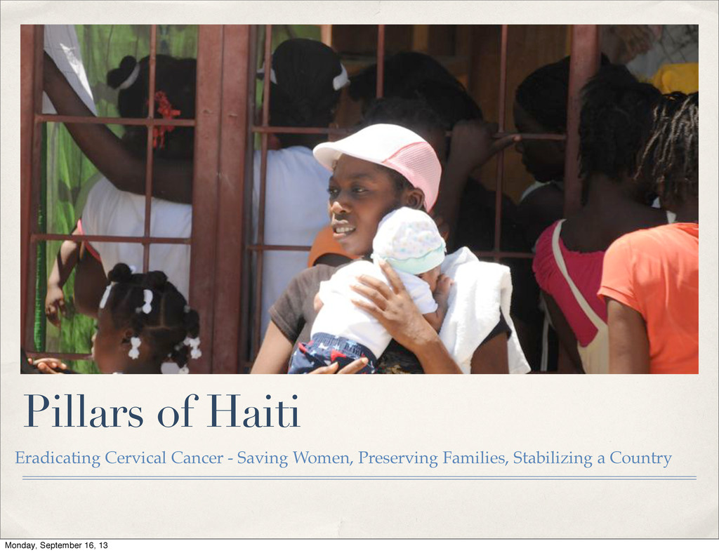 education, screening, and cervical cancer treatment, as well as to provide general wellness services to help save women, preserve families, and stabilize the country of Haiti. Monday, September 16, 13