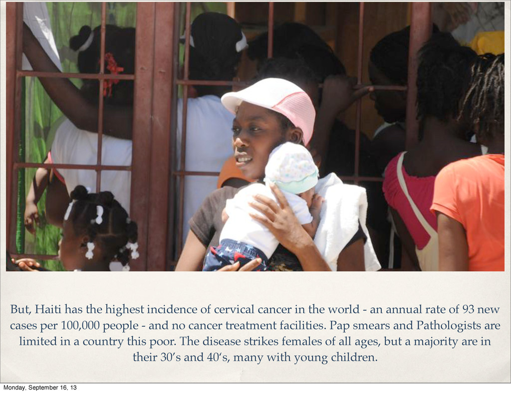 the world - an annual rate of 93 new cases per 100,000 people - and no cancer treatment facilities. Pap smears and Pathologists are limited in a country this poor. The disease strikes females of all ages, but a majority are in their 30’s and 40‘s, many with young children. Monday, September 16, 13