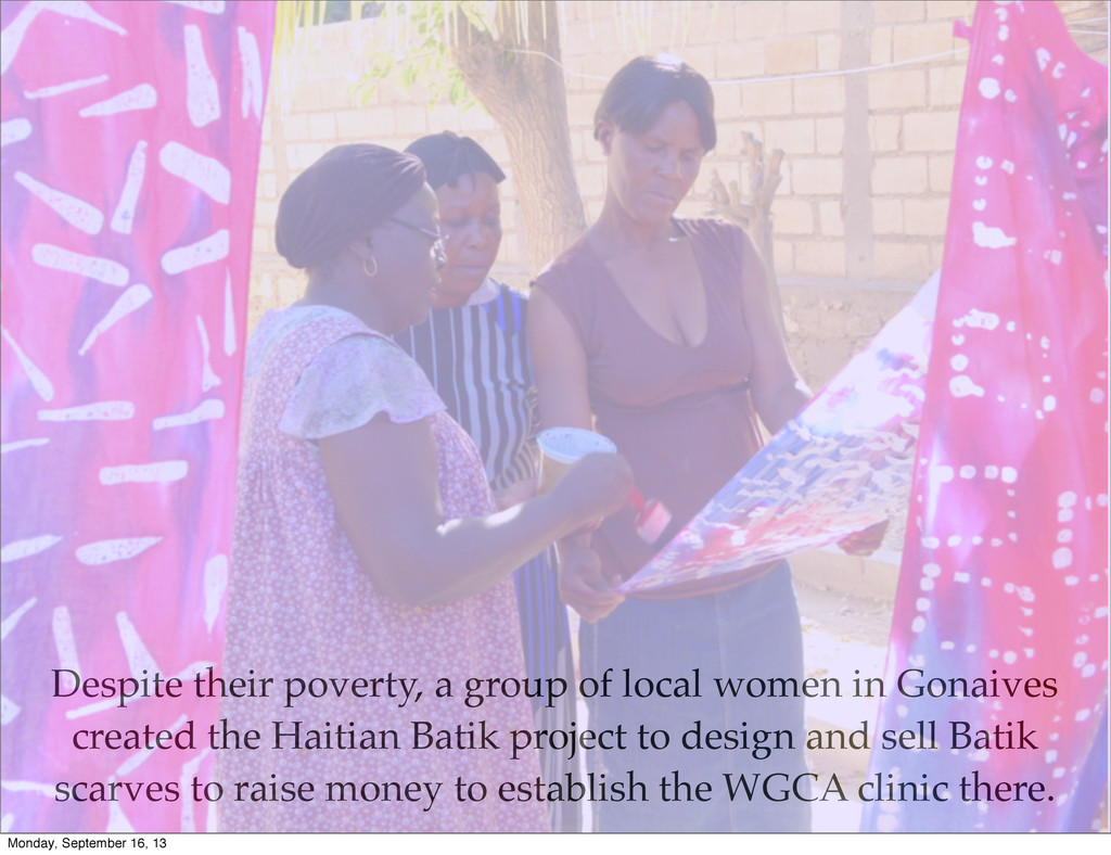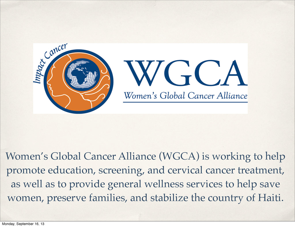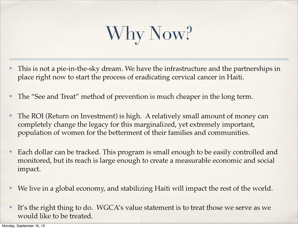 have the infrastructure and the partnerships in place right now to start the process of eradicating cervical cancer in Haiti. ✤ The “See and Treat” method of prevention is much cheaper in the long term. ✤ The ROI (Return on Investment) is high. A relatively small amount of money can completely change the legacy for this marginalized, yet extremely important, population of women for the betterment of their families and communities. ✤ Each dollar can be tracked. This program is small enough to be easily controlled and monitored, but its reach is large enough to create a measurable economic and social impact. ✤ We live in a global economy, and stabilizing Haiti will impact the rest of the world. ✤ It’s the right thing to do. WGCA’s value statement is to treat those we serve as we would like to be treated. Monday, September 16, 13