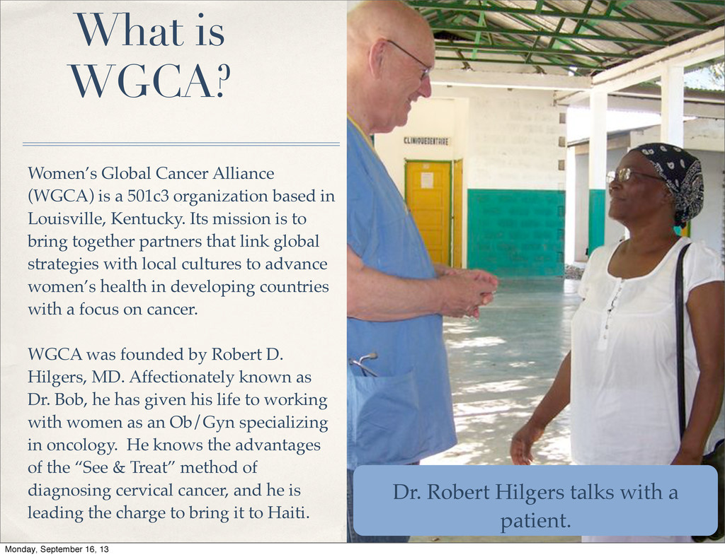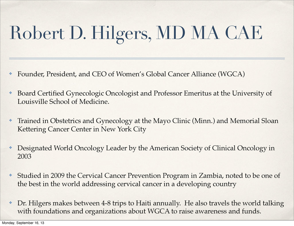 CEO of Women’s Global Cancer Alliance (WGCA) ✤ Board Certified Gynecologic Oncologist and Professor Emeritus at the University of Louisville School of Medicine. ✤ Trained in Obstetrics and Gynecology at the Mayo Clinic (Minn.) and Memorial Sloan Kettering Cancer Center in New York City ✤ Designated World Oncology Leader by the American Society of Clinical Oncology in 2003 ✤ Studied in 2009 the Cervical Cancer Prevention Program in Zambia, noted to be one of the best in the world addressing cervical cancer in a developing country ✤ Dr. Hilgers makes between 4-8 trips to Haiti annually. He also travels the world talking with foundations and organizations about WGCA to raise awareness and funds. Monday, September 16, 13