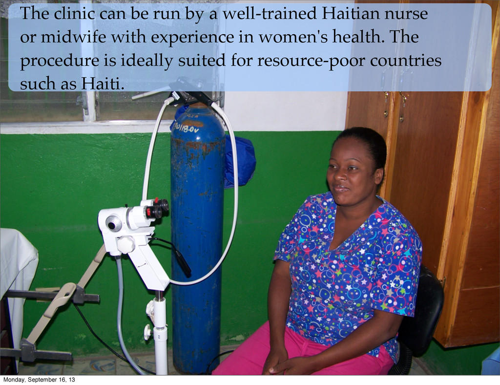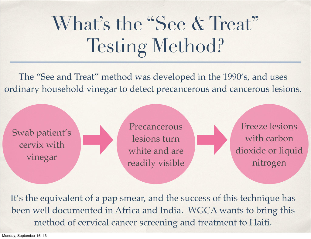 Treat” method was developed in the 1990‘s, and uses ordinary household vinegar to detect precancerous and cancerous lesions. It’s the equivalent of a pap smear, and the success of this technique has been well documented in Africa and India. WGCA wants to bring this method of cervical cancer screening and treatment to Haiti. Swab patient’s cervix with vinegar Precancerous lesions turn white and are readily visible Freeze lesions with carbon dioxide or liquid nitrogen Monday, September 16, 13