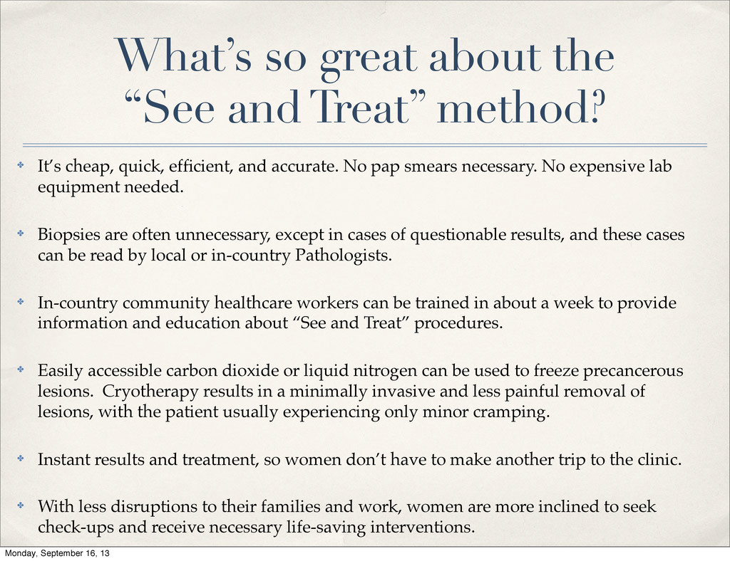It’s cheap, quick, efficient, and accurate. No pap smears necessary. No expensive lab equipment needed. ✤ Biopsies are often unnecessary, except in cases of questionable results, and these cases can be read by local or in-country Pathologists. ✤ In-country community healthcare workers can be trained in about a week to provide information and education about “See and Treat” procedures. ✤ Easily accessible carbon dioxide or liquid nitrogen can be used to freeze precancerous lesions. Cryotherapy results in a minimally invasive and less painful removal of lesions, with the patient usually experiencing only minor cramping. ✤ Instant results and treatment, so women don’t have to make another trip to the clinic. ✤ With less disruptions to their families and work, women are more inclined to seek check-ups and receive necessary life-saving interventions. Monday, September 16, 13