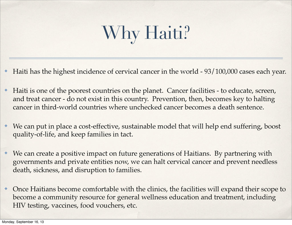 cancer in the world - 93/100,000 cases each year. ✤ Haiti is one of the poorest countries on the planet. Cancer facilities - to educate, screen, and treat cancer - do not exist in this country. Prevention, then, becomes key to halting cancer in third-world countries where unchecked cancer becomes a death sentence. ✤ We can put in place a cost-effective, sustainable model that will help end suffering, boost quality-of-life, and keep families in tact. ✤ We can create a positive impact on future generations of Haitians. By partnering with governments and private entities now, we can halt cervical cancer and prevent needless death, sickness, and disruption to families. ✤ Once Haitians become comfortable with the clinics, the facilities will expand their scope to become a community resource for general wellness education and treatment, including HIV testing, vaccines, food vouchers, etc. Monday, September 16, 13