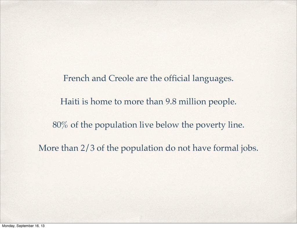 to more than 9.8 million people. 80% of the population live below the poverty line. More than 2/3 of the population do not have formal jobs. Monday, September 16, 13