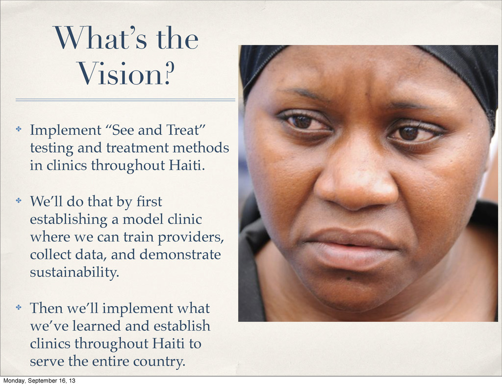treatment methods in clinics throughout Haiti. ✤ We’ll do that by first establishing a model clinic where we can train providers, collect data, and demonstrate sustainability. ✤ Then we’ll implement what we’ve learned and establish clinics throughout Haiti to serve the entire country. Monday, September 16, 13