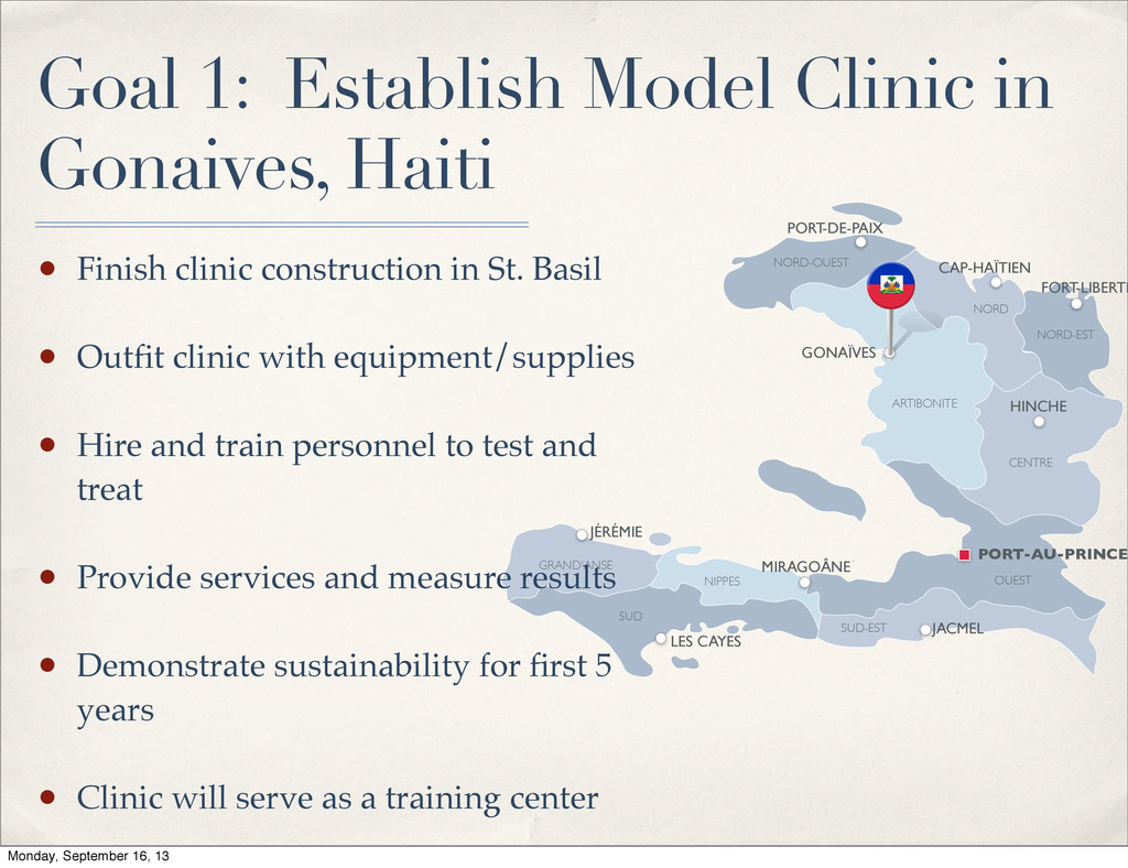 CAP-HAÏTIEN NORD-EST FORT-LIBERTÉ NORD-OUEST PORT-DE-PAIX OUEST SUD-EST JACMEL SUD LES CAYES Goal 1: Establish Model Clinic in Gonaives, Haiti • Finish clinic construction in St. Basil • Outfit clinic with equipment/supplies • Hire and train personnel to test and treat • Provide services and measure results • Demonstrate sustainability for first 5 years • Clinic will serve as a training center Monday, September 16, 13