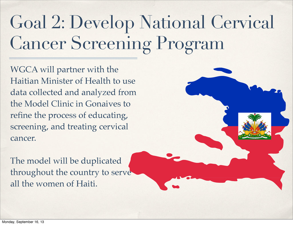 partner with the Haitian Minister of Health to use data collected and analyzed from the Model Clinic in Gonaives to refine the process of educating, screening, and treating cervical cancer. The model will be duplicated throughout the country to serve all the women of Haiti. Monday, September 16, 13
