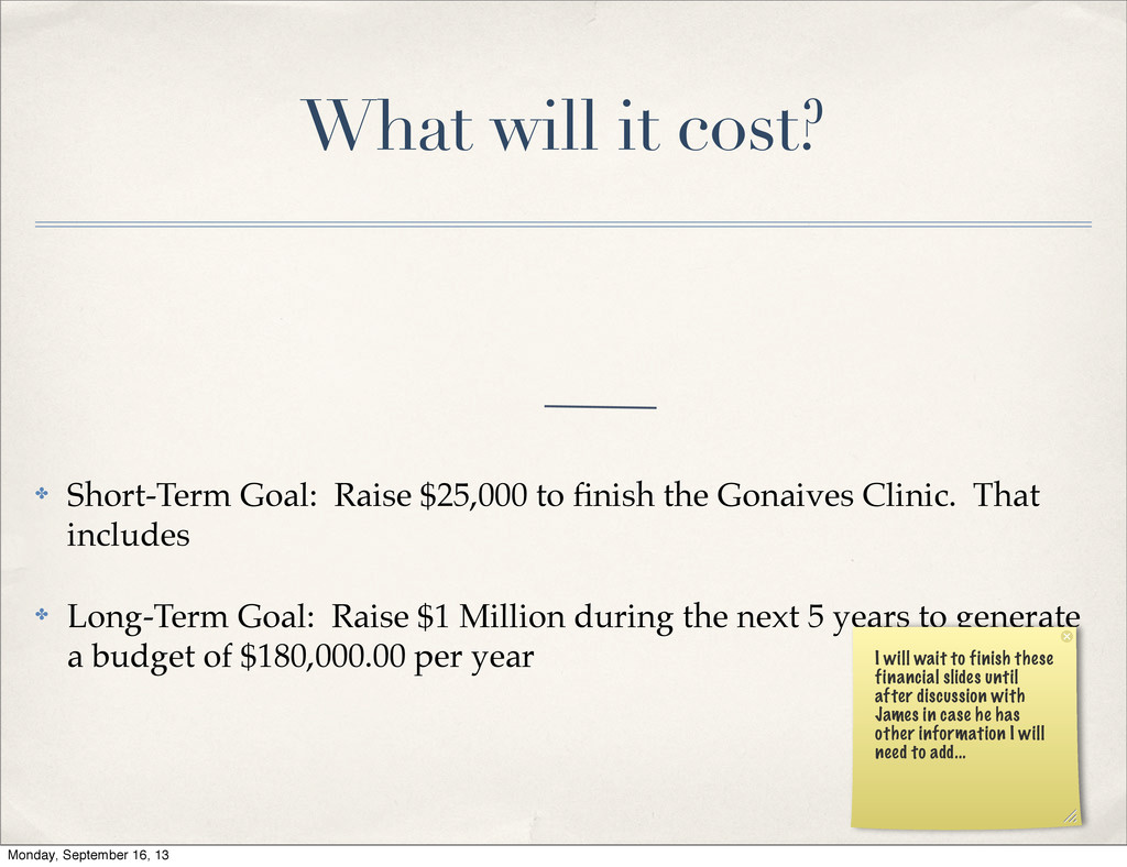 finish the Gonaives Clinic. That includes ✤ Long-Term Goal: Raise $1 Million during the next 5 years to generate a budget of $180,000.00 per year I will wait to finish these financial slides until after discussion with James in case he has other information I will need to add... Monday, September 16, 13