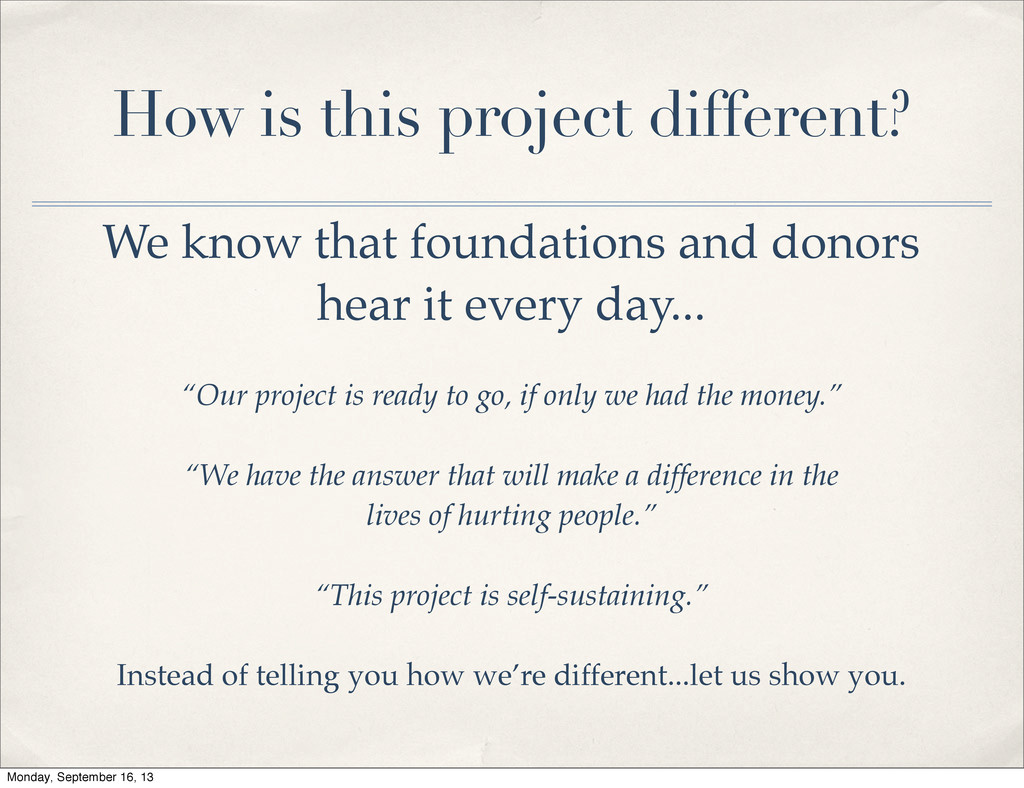 donors hear it every day... “Our project is ready to go, if only we had the money.” “We have the answer that will make a difference in the lives of hurting people.” “This project is self-sustaining.” Instead of telling you how we’re different...let us show you. Monday, September 16, 13
