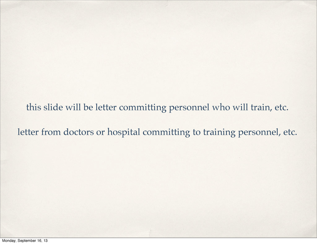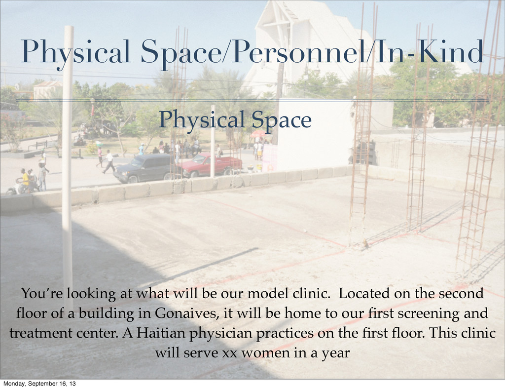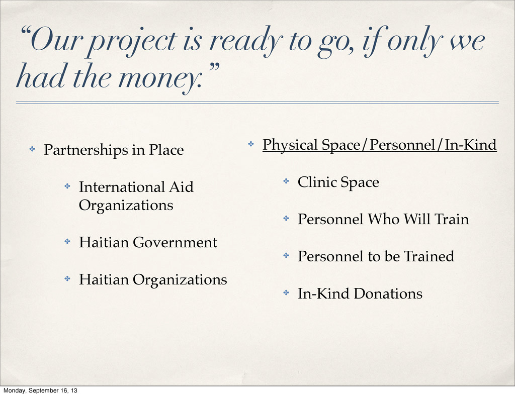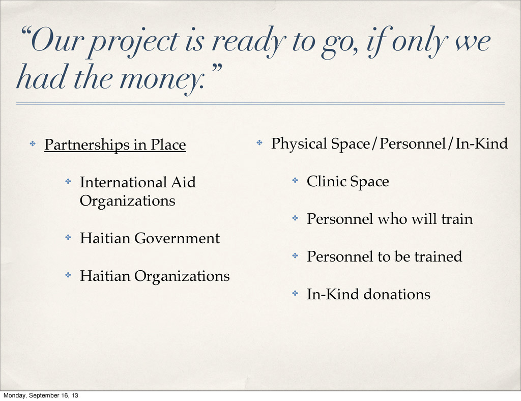 the money.” ✤ Partnerships in Place ✤ International Aid Organizations ✤ Haitian Government ✤ Haitian Organizations ✤ Physical Space/Personnel/In-Kind ✤ Clinic Space ✤ Personnel who will train ✤ Personnel to be trained ✤ In-Kind donations Monday, September 16, 13