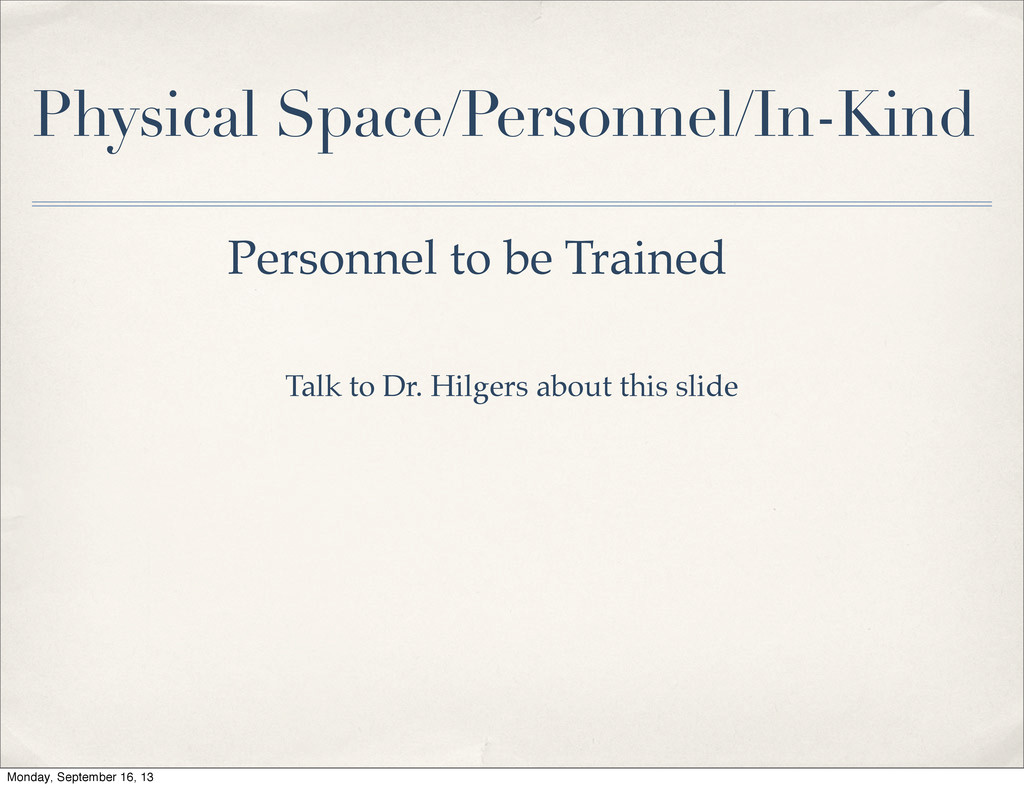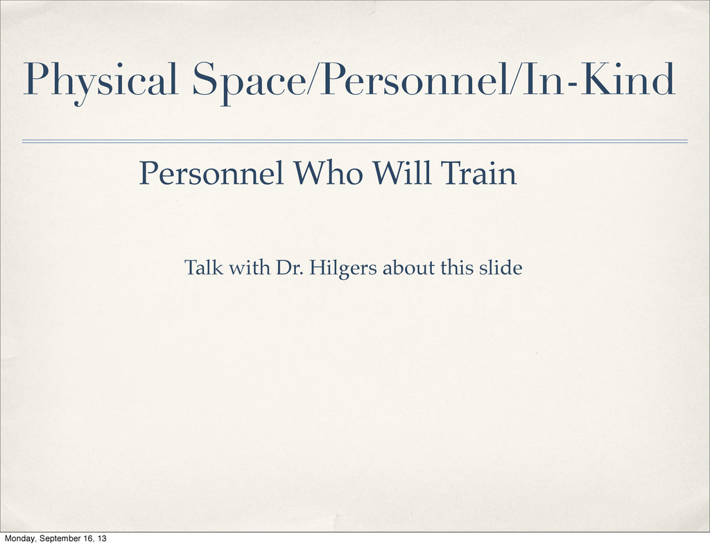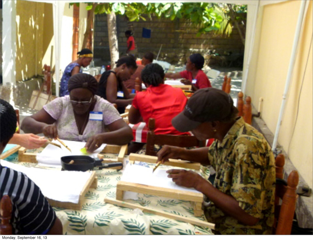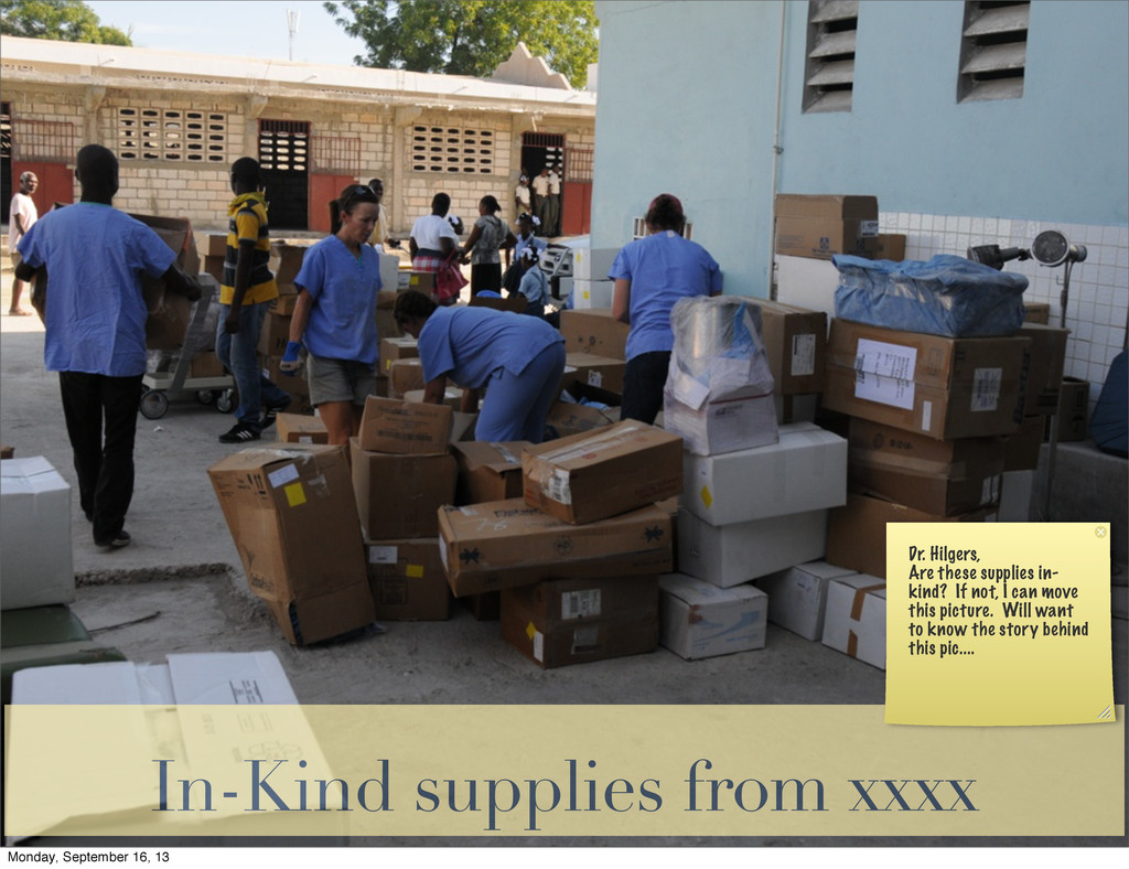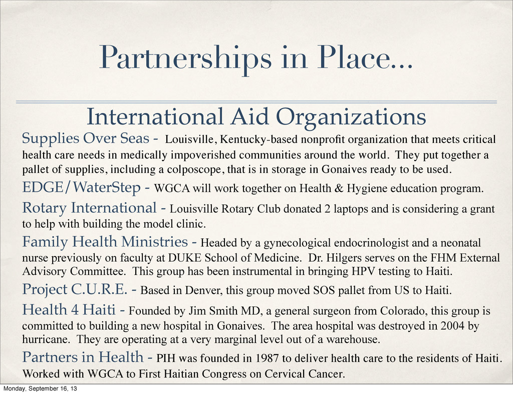the money.” ✤ Partnerships in Place ✤ International Aid Organizations ✤ Haitian Government ✤ Haitian Organizations ✤ Physical Space/Personnel/In-Kind ✤ Clinic Space ✤ Personnel Who Will Train ✤ Personnel to be Trained ✤ In-Kind Donations Monday, September 16, 13