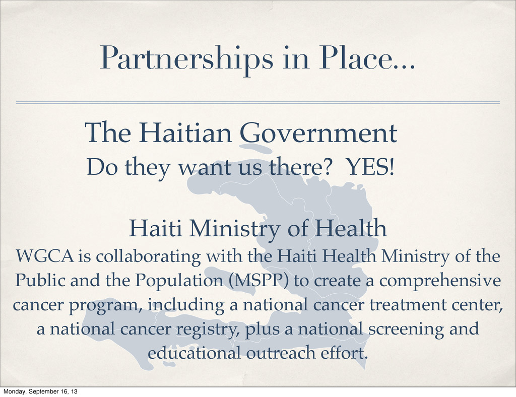 there? YES! Haiti Ministry of Health WGCA is collaborating with the Haiti Health Ministry of the Public and the Population (MSPP) to create a comprehensive cancer program, including a national cancer treatment center, a national cancer registry, plus a national screening and educational outreach effort. Monday, September 16, 13