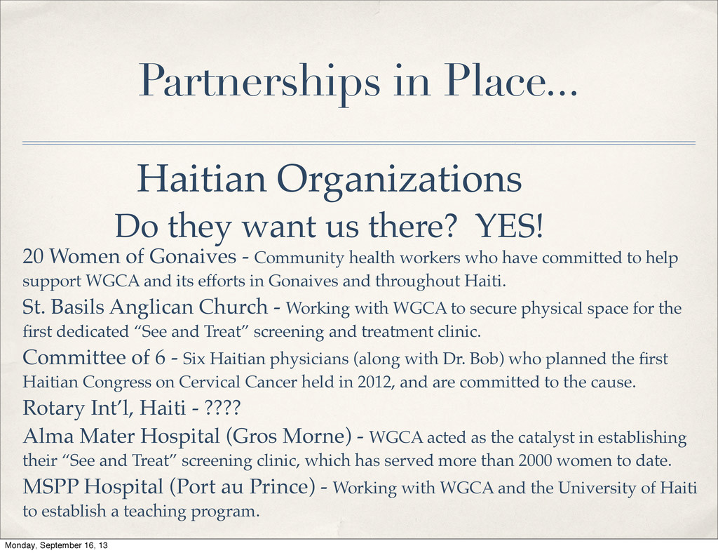 YES! 20 Women of Gonaives - Community health workers who have committed to help support WGCA and its efforts in Gonaives and throughout Haiti. St. Basils Anglican Church - Working with WGCA to secure physical space for the first dedicated “See and Treat” screening and treatment clinic. Committee of 6 - Six Haitian physicians (along with Dr. Bob) who planned the first Haitian Congress on Cervical Cancer held in 2012, and are committed to the cause. Rotary Int’l, Haiti - ???? Alma Mater Hospital (Gros Morne) - WGCA acted as the catalyst in establishing their “See and Treat” screening clinic, which has served more than 2000 women to date. MSPP Hospital (Port au Prince) - Working with WGCA and the University of Haiti to establish a teaching program. Monday, September 16, 13