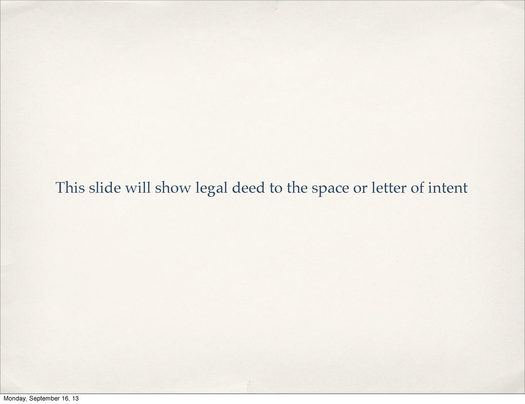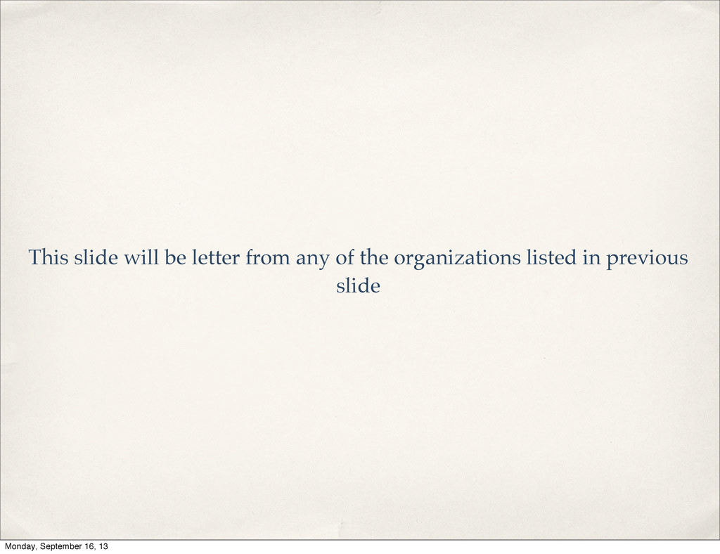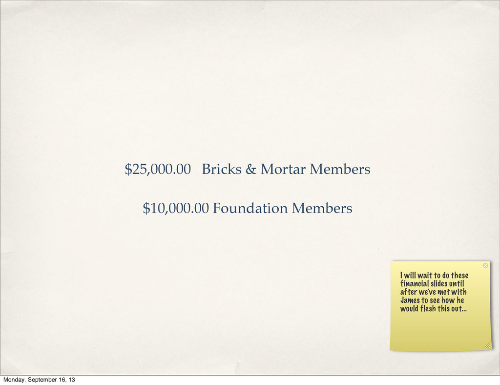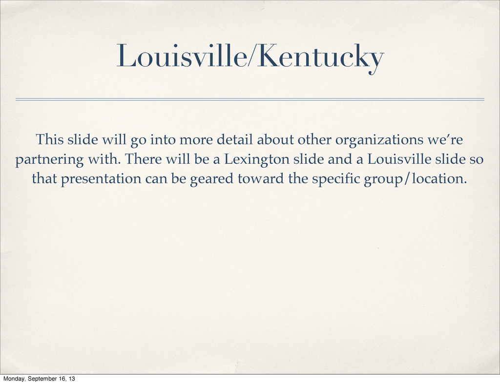 organizations we’re partnering with. There will be a Lexington slide and a Louisville slide so that presentation can be geared toward the specific group/location. Monday, September 16, 13