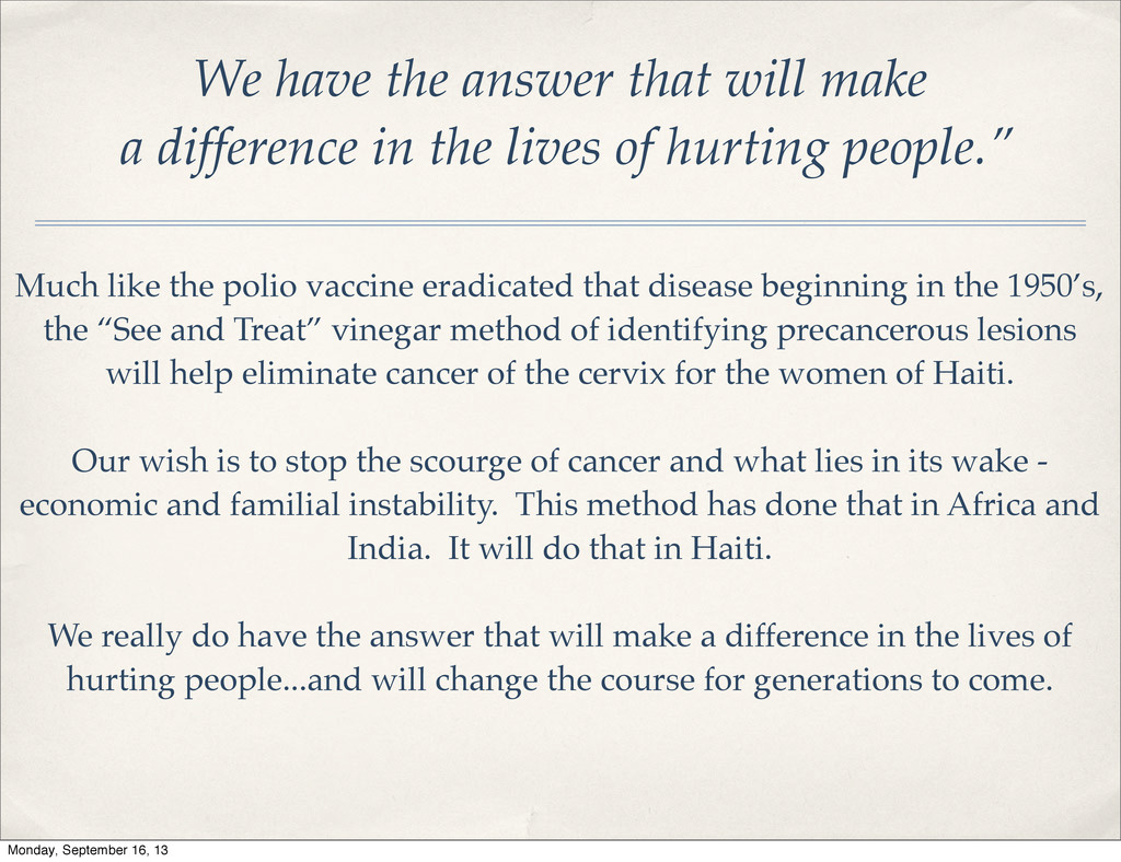 the lives of hurting people.” Much like the polio vaccine eradicated that disease beginning in the 1950’s, the “See and Treat” vinegar method of identifying precancerous lesions will help eliminate cancer of the cervix for the women of Haiti. Our wish is to stop the scourge of cancer and what lies in its wake - economic and familial instability. This method has done that in Africa and India. It will do that in Haiti. We really do have the answer that will make a difference in the lives of hurting people...and will change the course for generations to come. Monday, September 16, 13