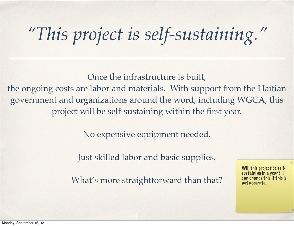 ongoing costs are labor and materials. With support from the Haitian government and organizations around the word, including WGCA, this project will be self-sustaining within the first year. No expensive equipment needed. Just skilled labor and basic supplies. What’s more straightforward than that? Will this project be self- sustaining in a year? I can change this if this is not accurate... Monday, September 16, 13