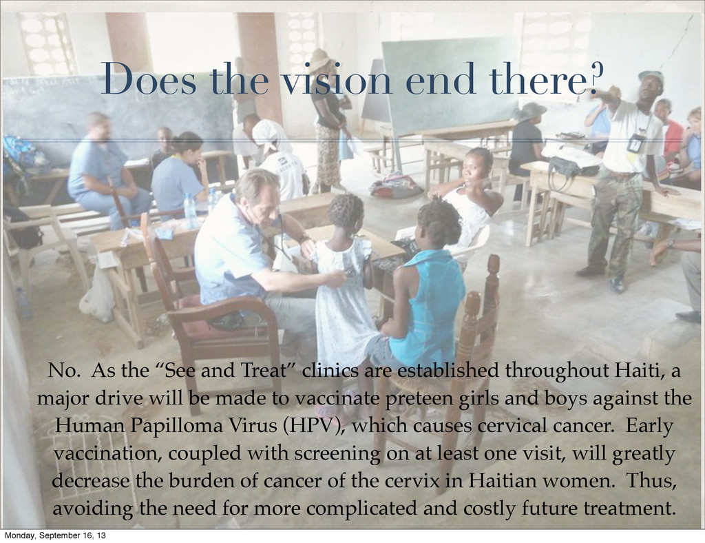 Treat” clinics are established throughout Haiti, a major drive will be made to vaccinate preteen girls and boys against the Human Papilloma Virus (HPV), which causes cervical cancer. Early vaccination, coupled with screening on at least one visit, will greatly decrease the burden of cancer of the cervix in Haitian women. Thus, avoiding the need for more complicated and costly future treatment. Monday, September 16, 13
