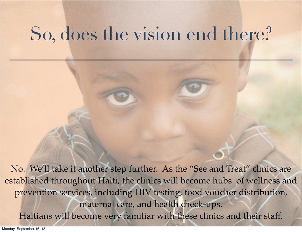 another step further. As the “See and Treat” clinics are established throughout Haiti, the clinics will become hubs of wellness and prevention services, including HIV testing, food voucher distribution, maternal care, and health check-ups. Haitians will become very familiar with these clinics and their staff. Monday, September 16, 13