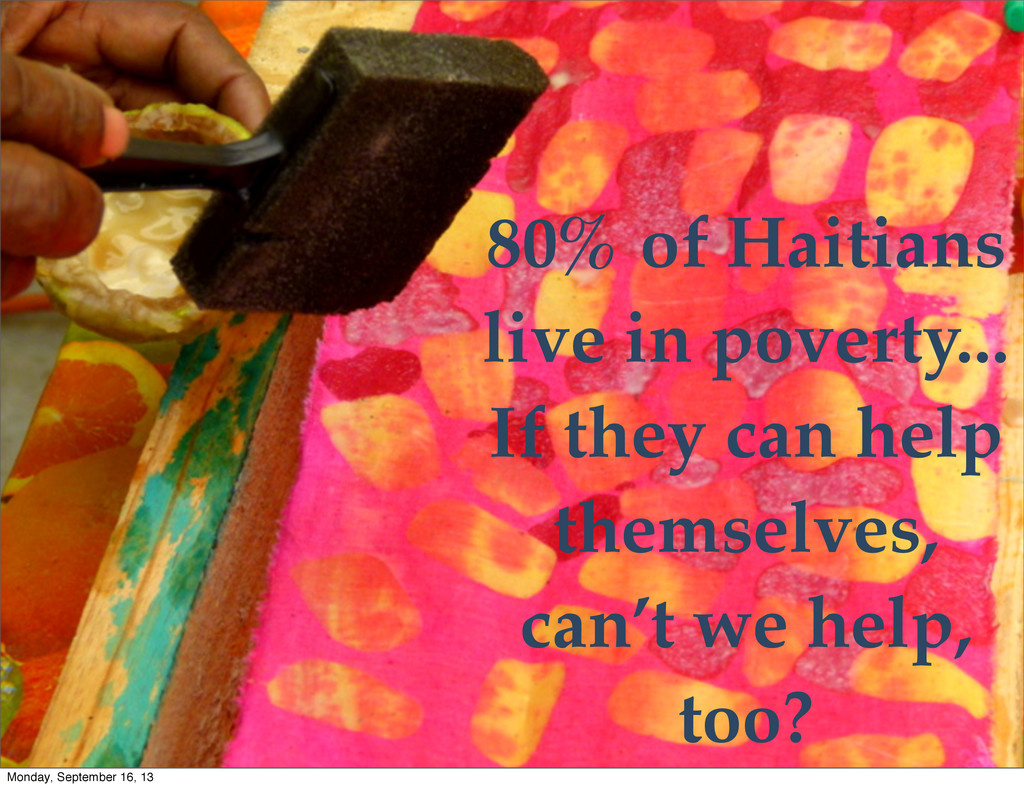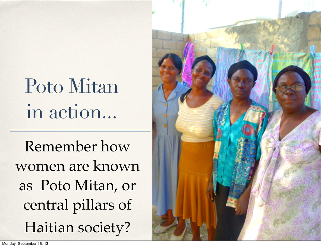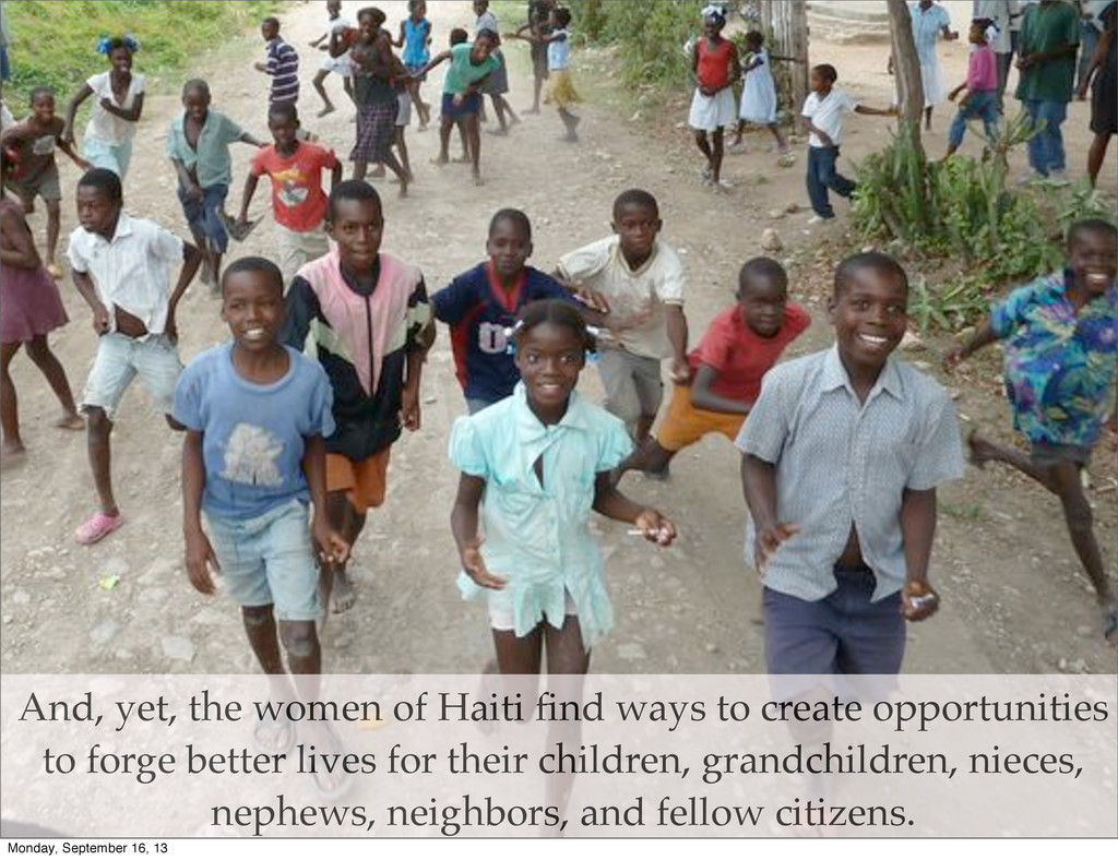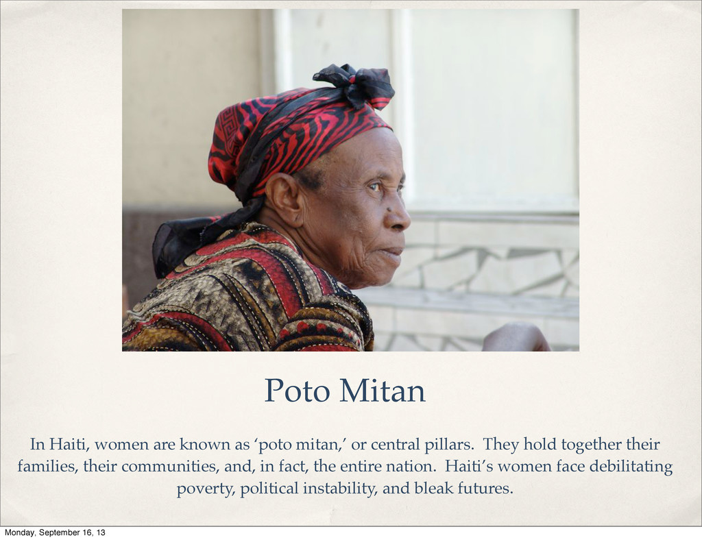 or central pillars. They hold together their families, their communities, and, in fact, the entire nation. Haiti’s women face debilitating poverty, political instability, and bleak futures. Monday, September 16, 13