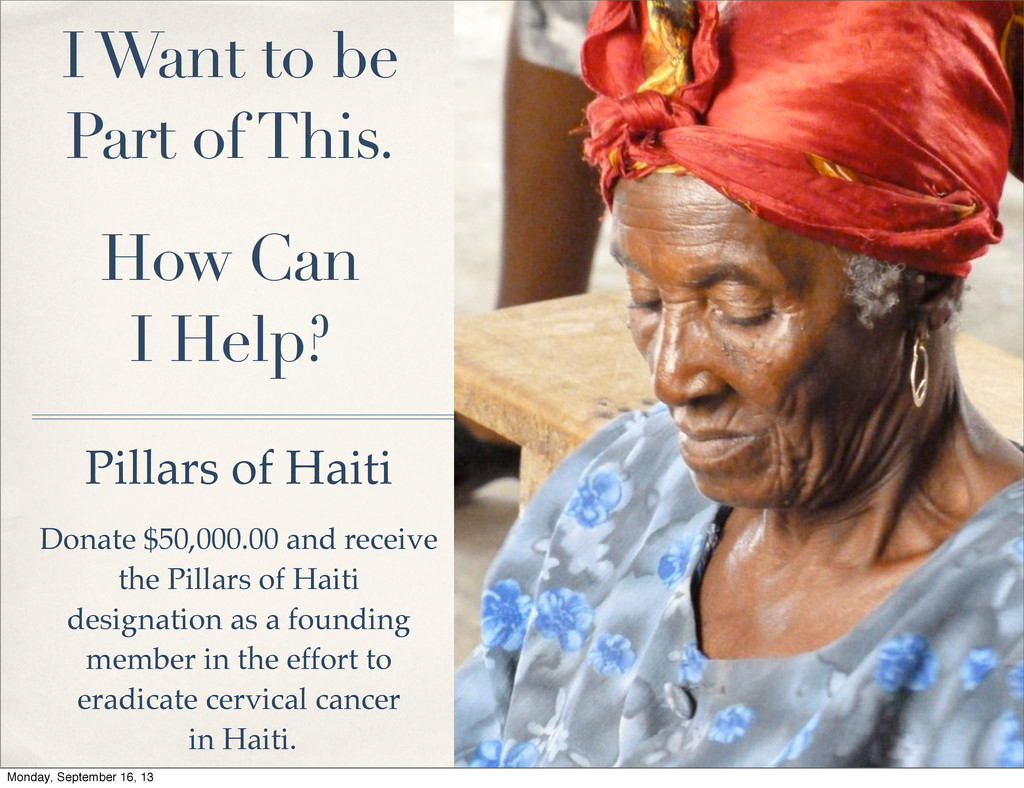 Help? Pillars of Haiti Donate $50,000.00 and receive the Pillars of Haiti designation as a founding member in the effort to eradicate cervical cancer in Haiti. Monday, September 16, 13