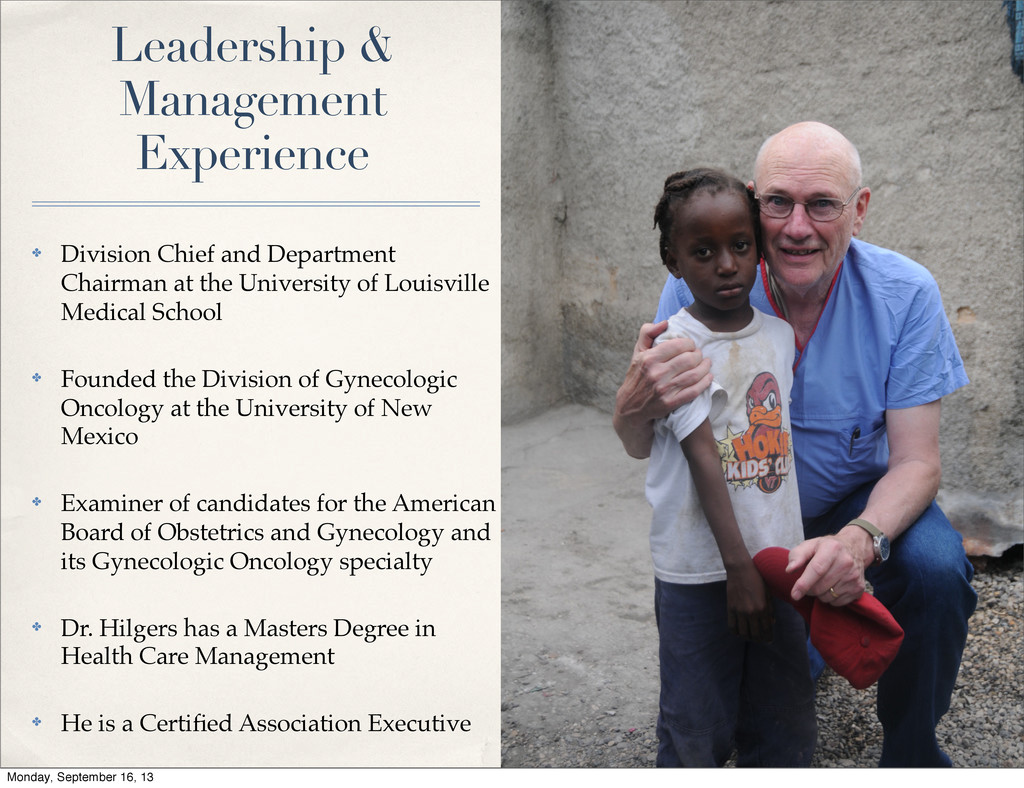 at the University of Louisville Medical School ✤ Founded the Division of Gynecologic Oncology at the University of New Mexico ✤ Examiner of candidates for the American Board of Obstetrics and Gynecology and its Gynecologic Oncology specialty ✤ Dr. Hilgers has a Masters Degree in Health Care Management ✤ He is a Certified Association Executive Monday, September 16, 13