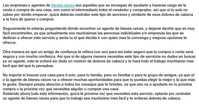 se encargan de ayudarte y hacerse cargo de la venta o compra de una casa, son como el intermediario entre el vendedor y comprador, así que si tu solo no sabes por dónde empezar, quizá deberás contratar este tipo de servicios y olvidarte de esos dolores de cabeza a la hora de querer o comprar. Seguramente te estarás preguntando dónde encontrar un agente de bienes raíces, y dejame decirte que es muy fácil encontrarles, ya que actualmente son muchísimas las personas individuales y/o empresas las que se dedican a ofrecer este servicio y serás tu el que decida ir con quien mas te convenga y mejores opciones te ofrezca. Otra manera es que un amigo de confianza te refiera con uno para asi estar seguro que tu compra o venta será segura y con mucha confianza. Así que si de alguna manera necesitas este tipo de servicios no dudes en buscar ya un agente, esto te evitará sin duda un montón de dolores de cabeza y te hará todo el trabajo muchisimo mas facil que del que tu pensabas. No importa si buscas una casa para ti solo, para tu familia, para un familiar o para tu grupo de amigos, ya que el o la agente de bienes raíces va a ofrecer muchas oportunidades para que tu puedas elegir la mejor y la que más te guste. Siempre presta atención a todos los consejos que te brinden, ya que eso va a ayudarte en tu próxima compra o la próxima vez que necesites alquilar o comprar una casa. Sabiendo ahora toda esta información, quizá la próxima vez que necesites este servicio, optarán por contratar un agente de bienes raíces para que tu trabajo sea muchisimo mas facil y te evitaras dolores de cabeza.