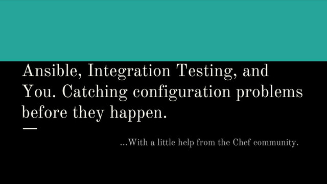 ◦ Builds upon unit-tests and tests them as a group or module. Within Ansible, this would be a role. ◦ Verifies all units executed and produced the desired outcome. ◦ Usually tested with a functional version of external dependencies. • Acceptance Testing ◦ Similar to Integration testing, Acceptance testing builds upon Integration testing. The intent is to test end-to-end, say an entire playbook of multiple roles. ◦ If at all possible, simulate end-user usage of the deployed system.