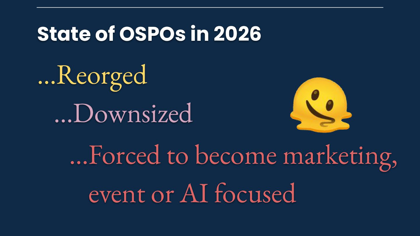 OSPOs in 2026 are facing a Seldon-crisis. With current trends in the face of “macroeconomic conditions”, and organizations pushing for the broader adoption of AI, many OSPOs have found themselves among the first groups to have their resources and headcount constrained, if not removed, and suddenly having to pivot to support organizational goals they’ve never considered before.